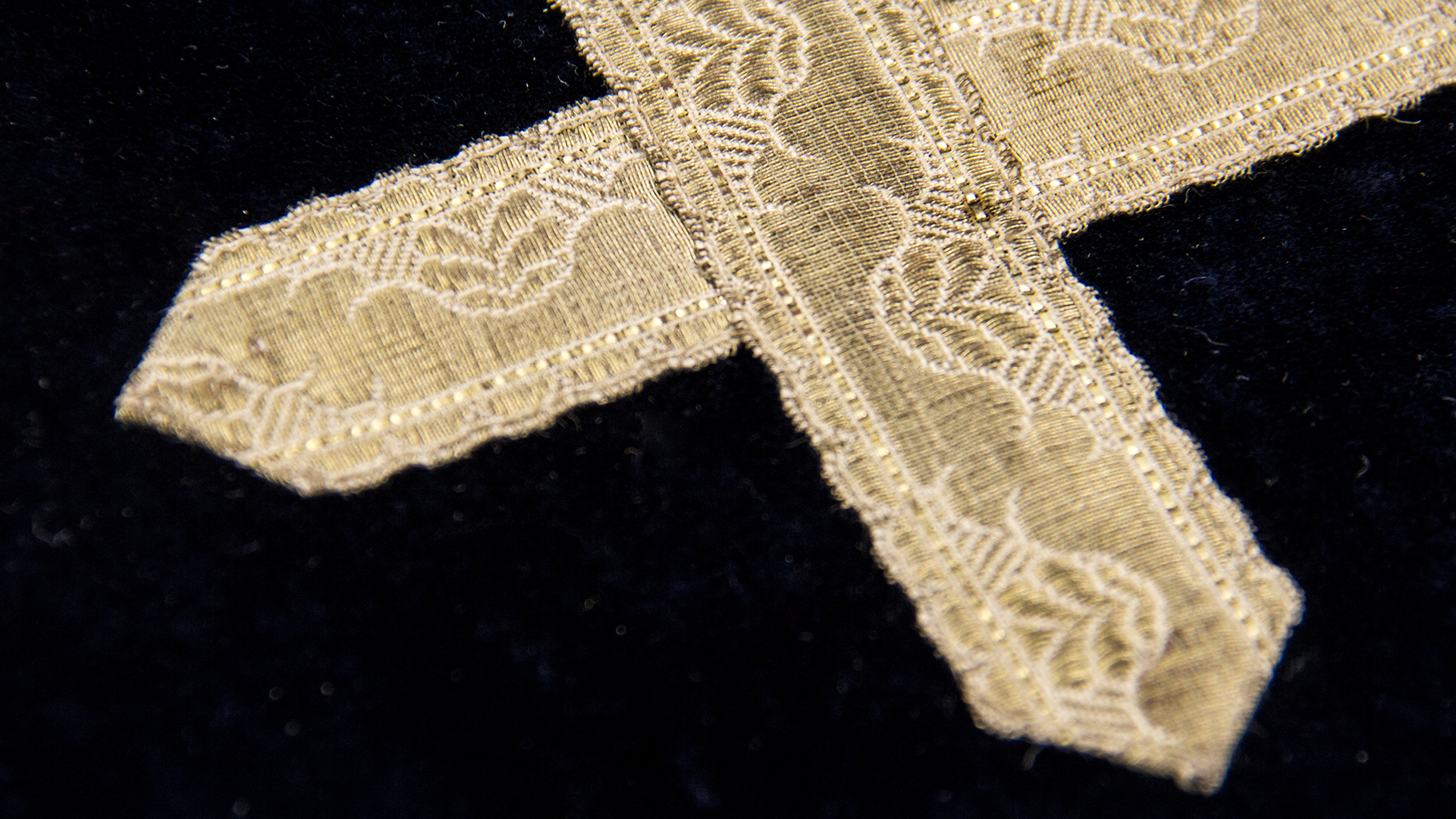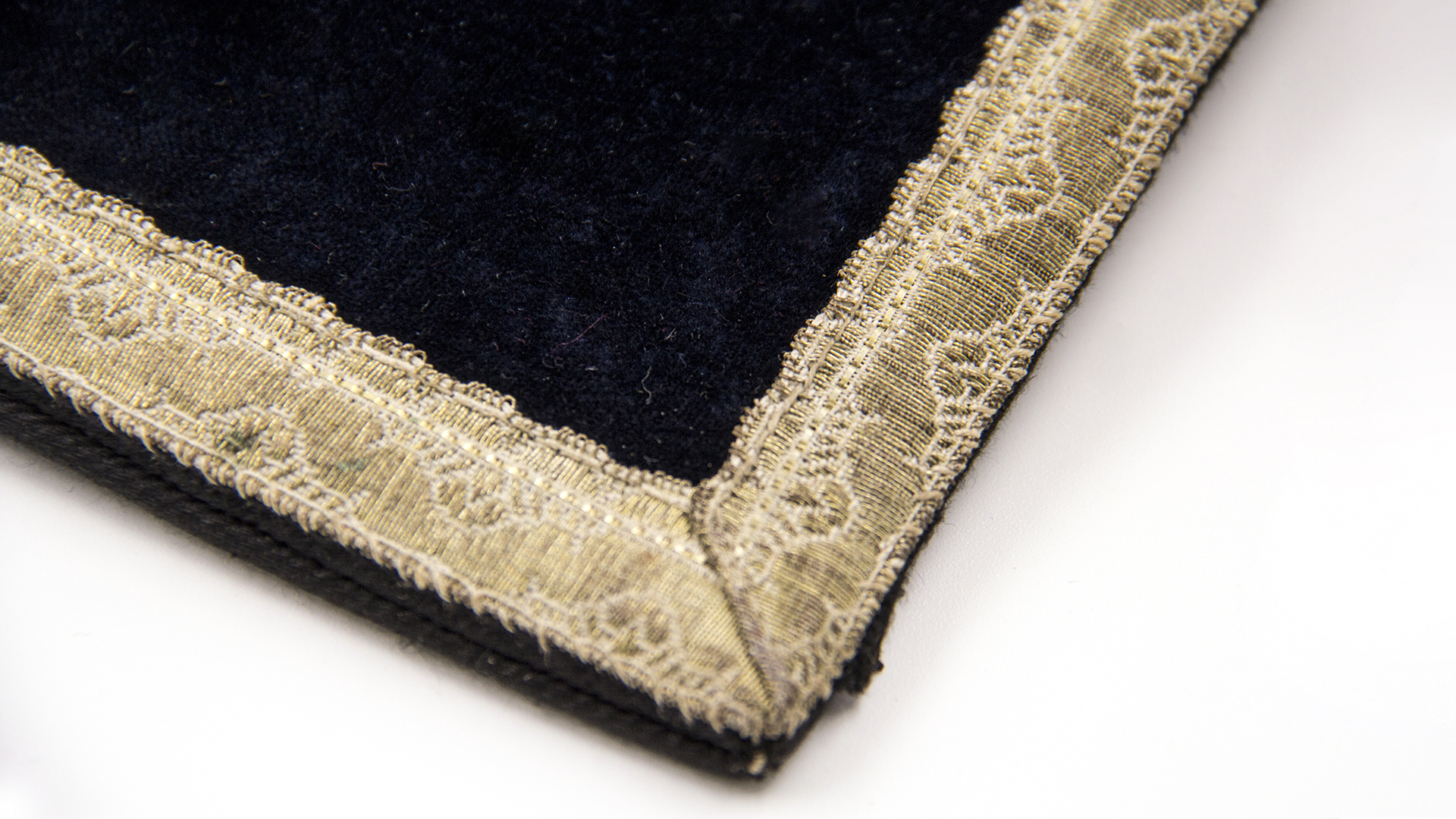 Black velvet with golden ribbon trim around the edges and forming a cross in the center.