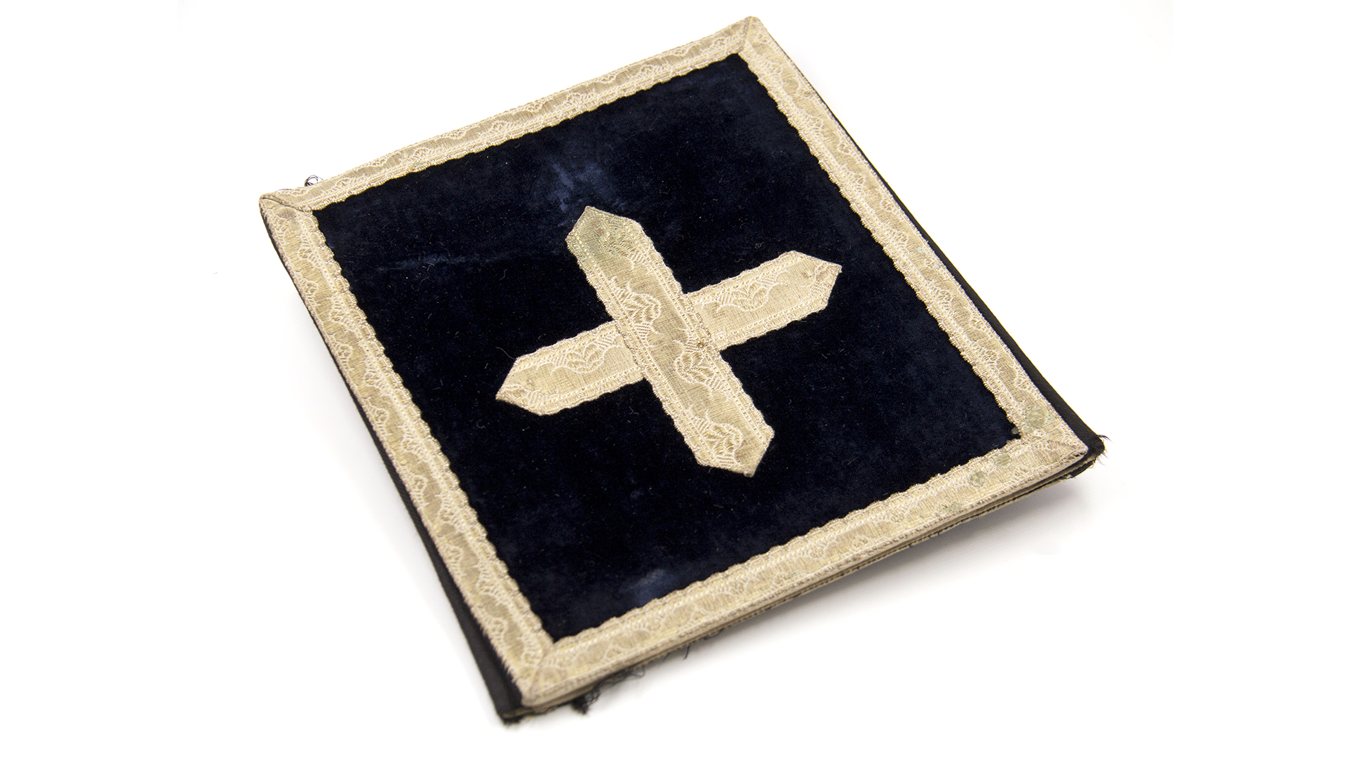 Terciopelo negro con cinta galón dorado en contornos y formando cruz al centro.