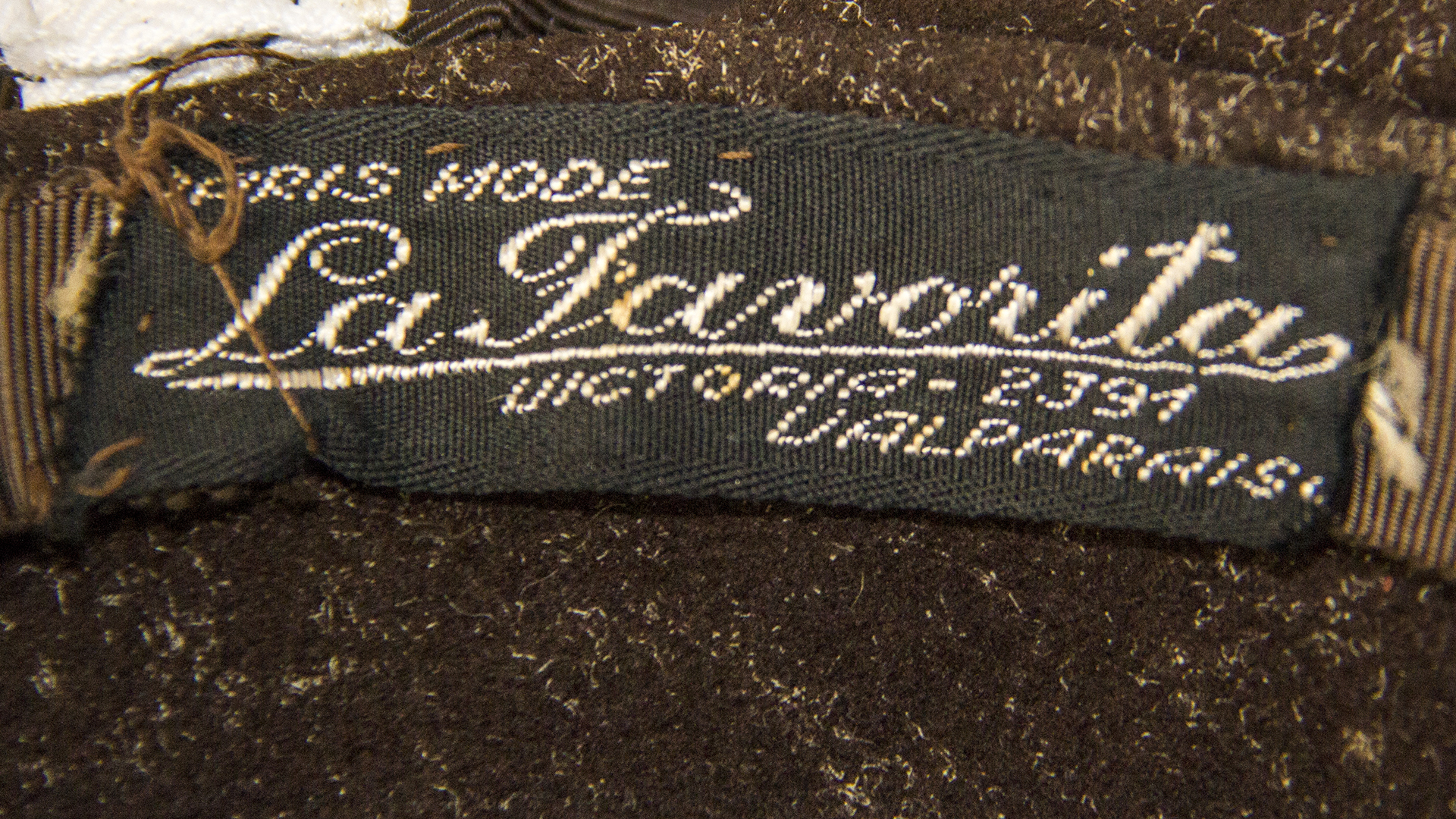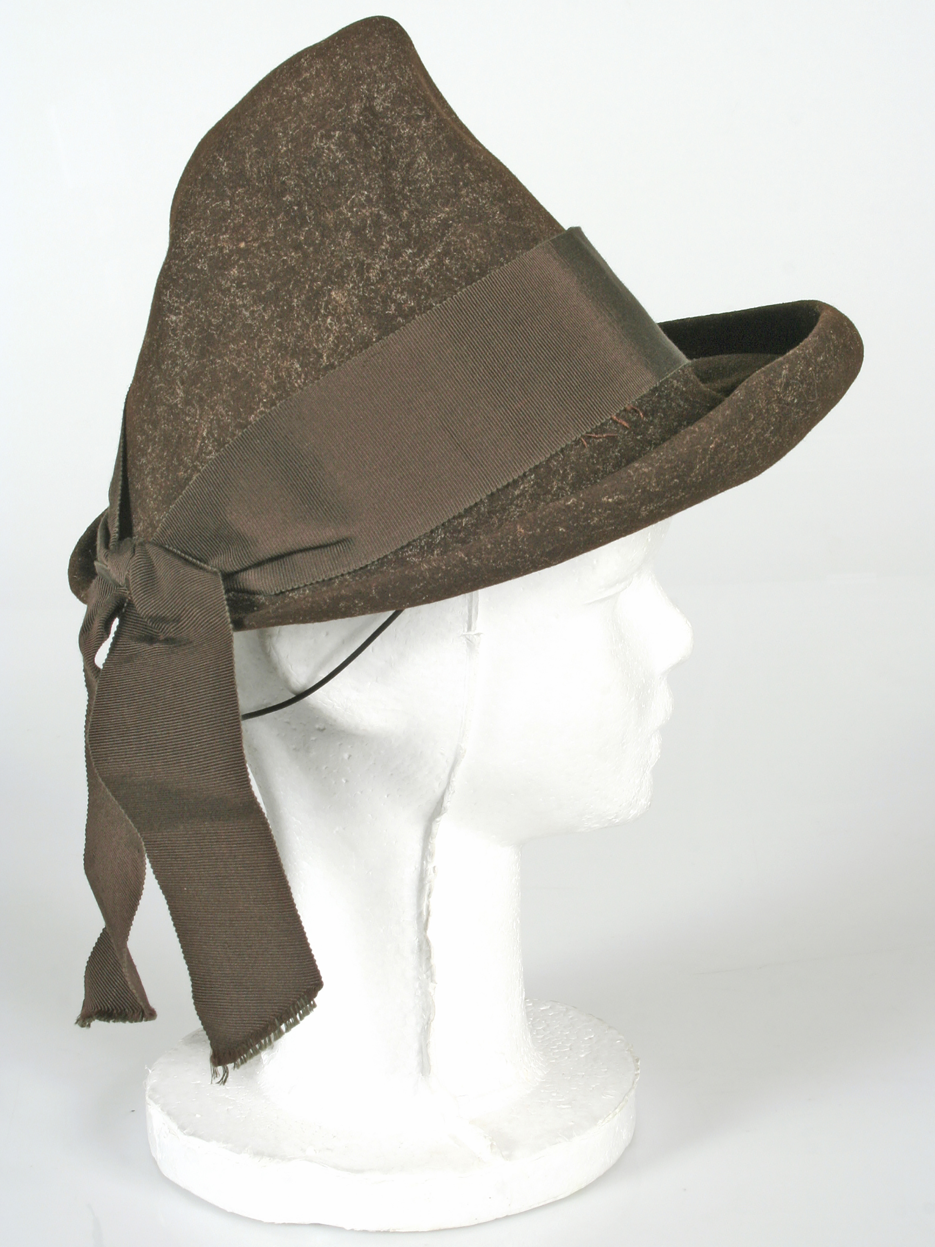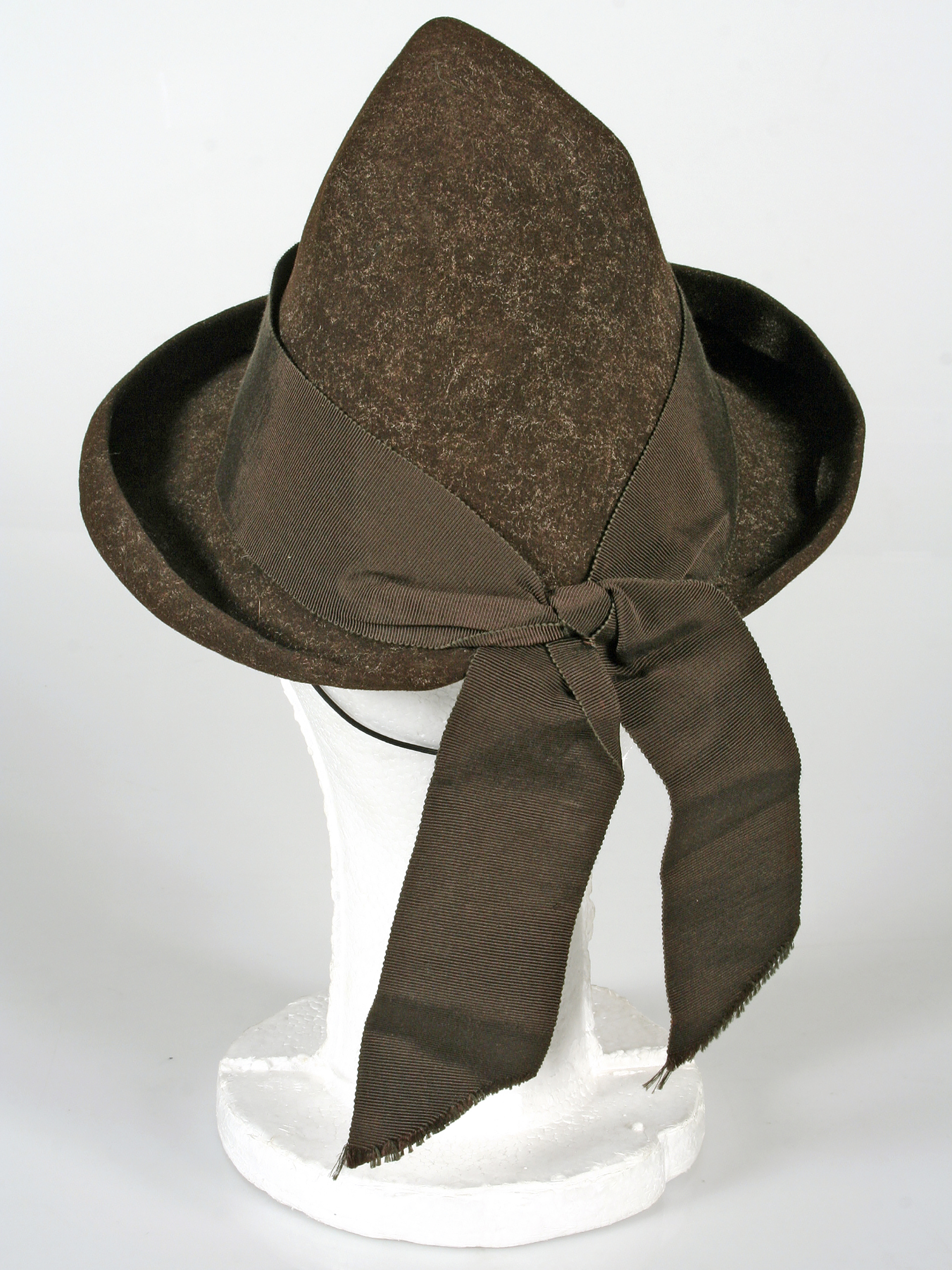 Tyrolean-style brown felt hat with a wide satin ribbon ending in a bow at the back. Label 'La Favorita', Victoria 2391 Valparaíso. Chilean manufacture.