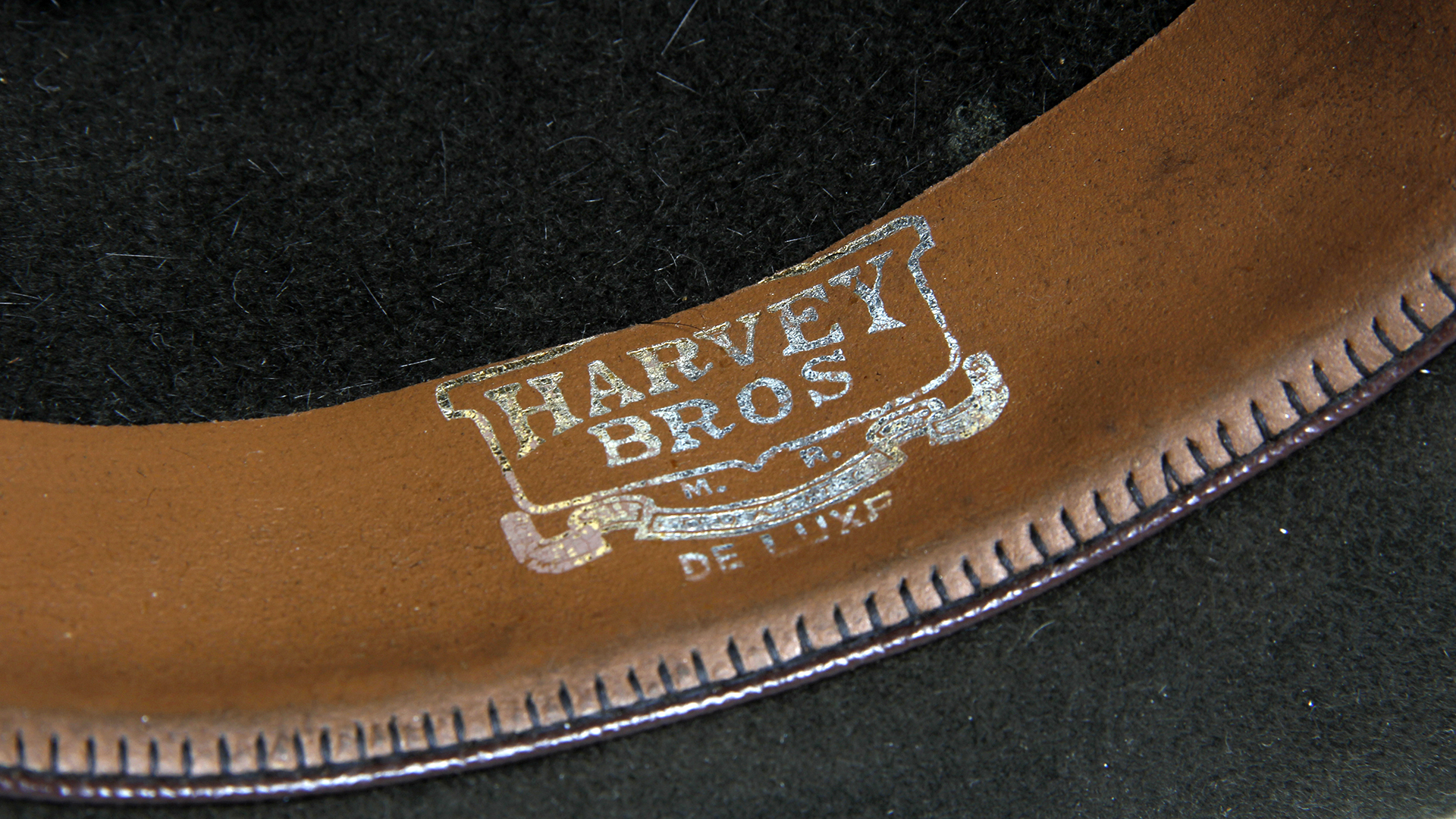 Brown hat with a brown ribbon and stitching in red, yellow, and gray. Assembled and sold by 'Woronoff Ltda.' hat shop in Valparaíso.