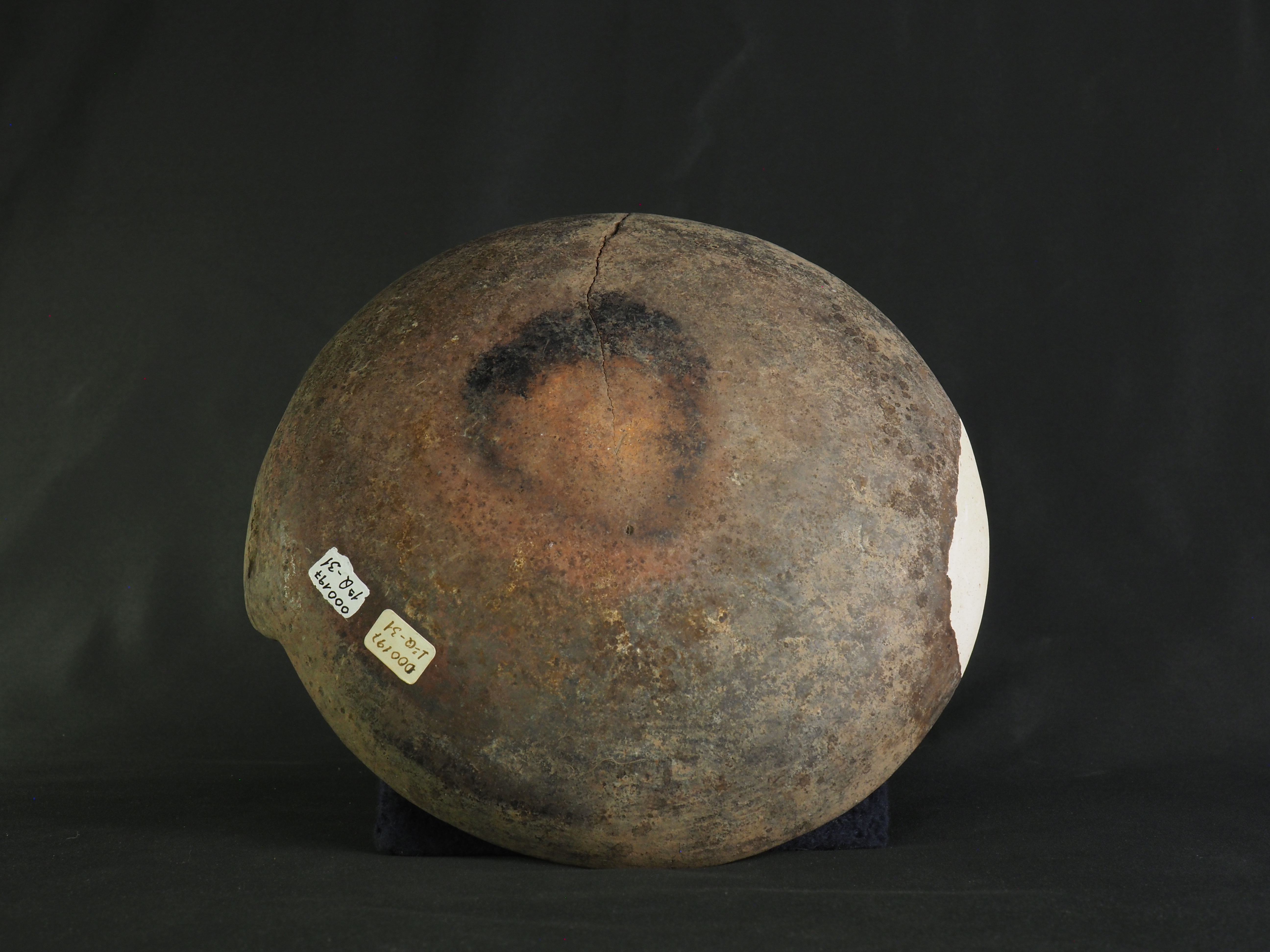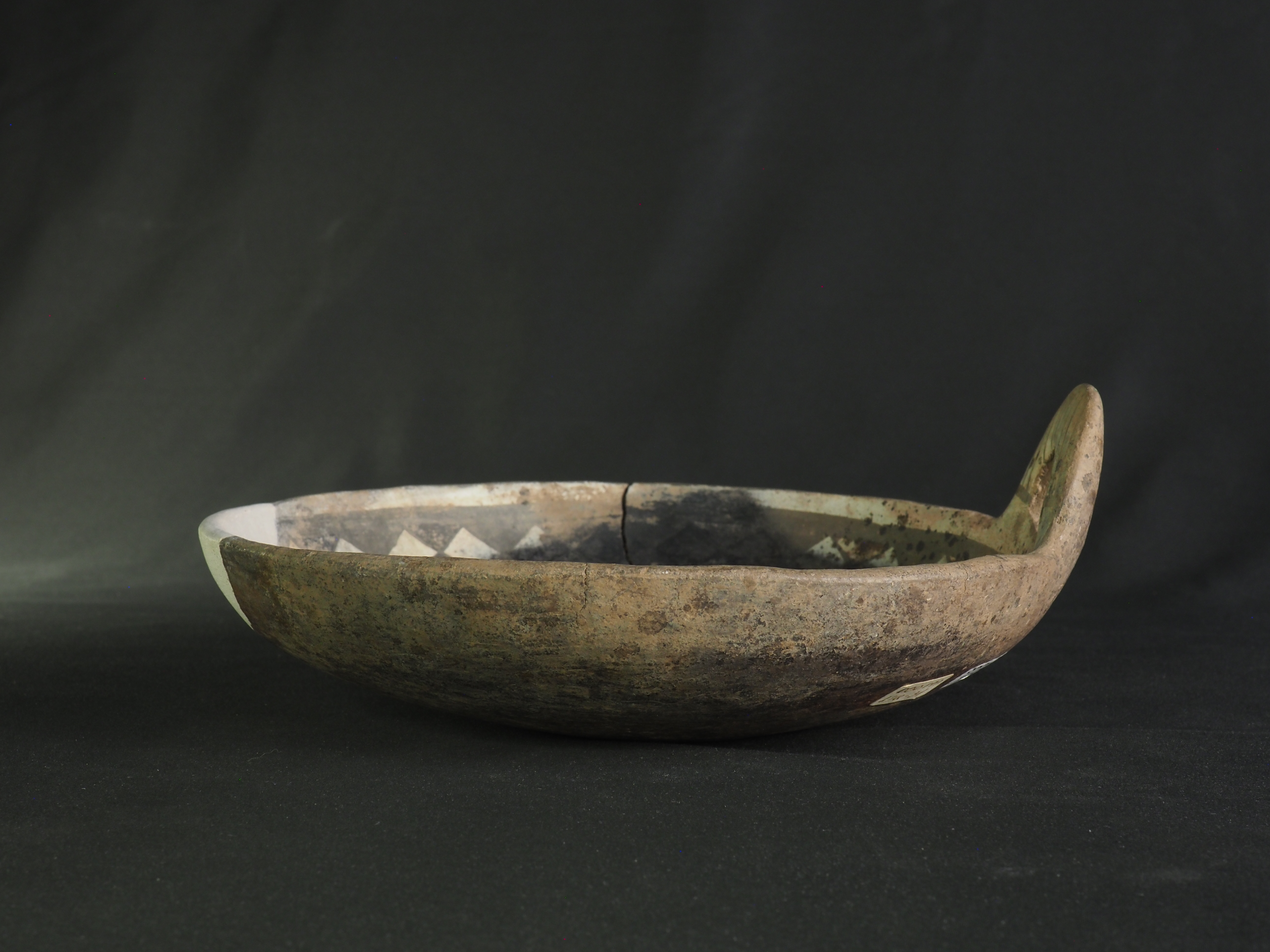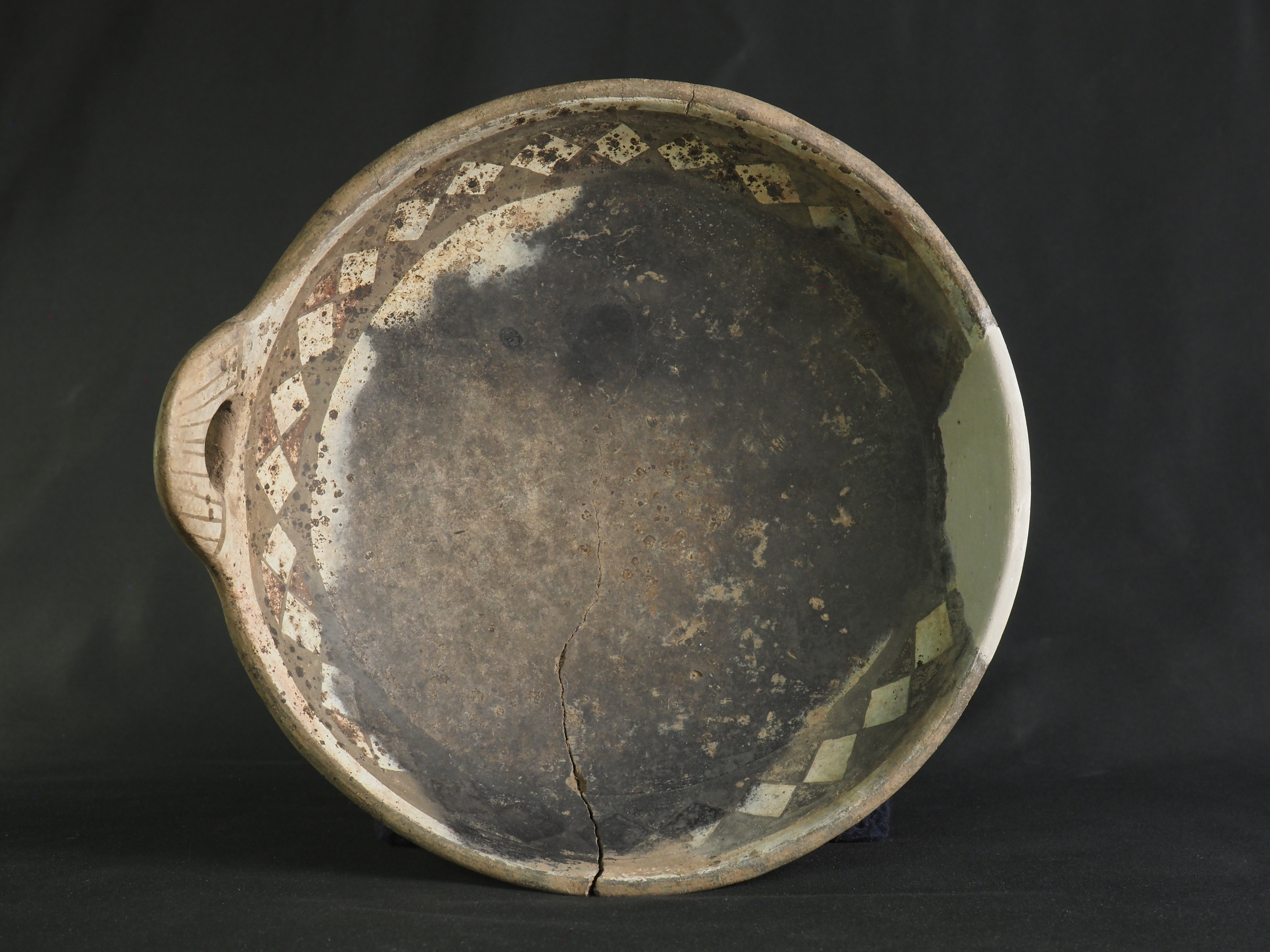 Contenedor abierto, blanco engobado en el interior y exterior. Presenta decoración geométrica en borde interno y asa con pigmento negro, consistente en una greca de rombos sobre fondo rojo y negro en forma alternada, a manera de clepsidra. Evidencia marcas de uso en interior y exterior. Técnica: Arcilla modelada, alisada, pulida y bruñida. Cerámica engobada policroma. Morfología: Objeto simétrico de estructura no restringida, perfil simple, cuerpo semiesférico, borde invertido, labio redondeado y base curva. Presenta un asa en arco de correa de sección elipsoidal como una extensión del borde. La unidad estructural del objeto se presenta en fragmentos unidos con sección faltante en la que se evidencia reintegración volumétrica con yeso blanco.