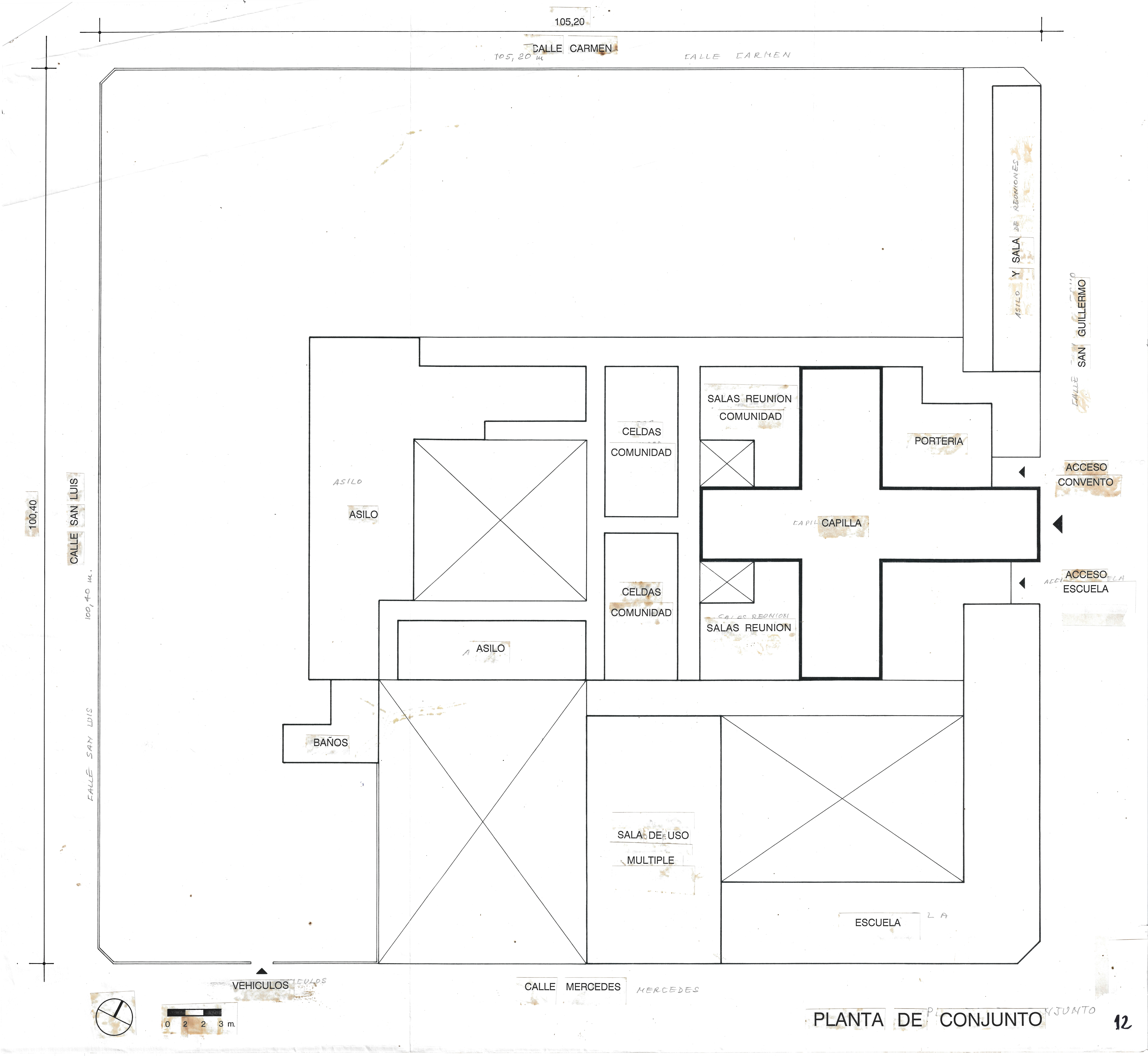 Plano n°18: planta conjunto, escala 1:200. Plano n°19: planta, escala 1:50. Plano n°20: corte A-A nave norte-nave sur, escala 1:50. Plano n°22 elevación oriente y corte C-C, escala 1:50.