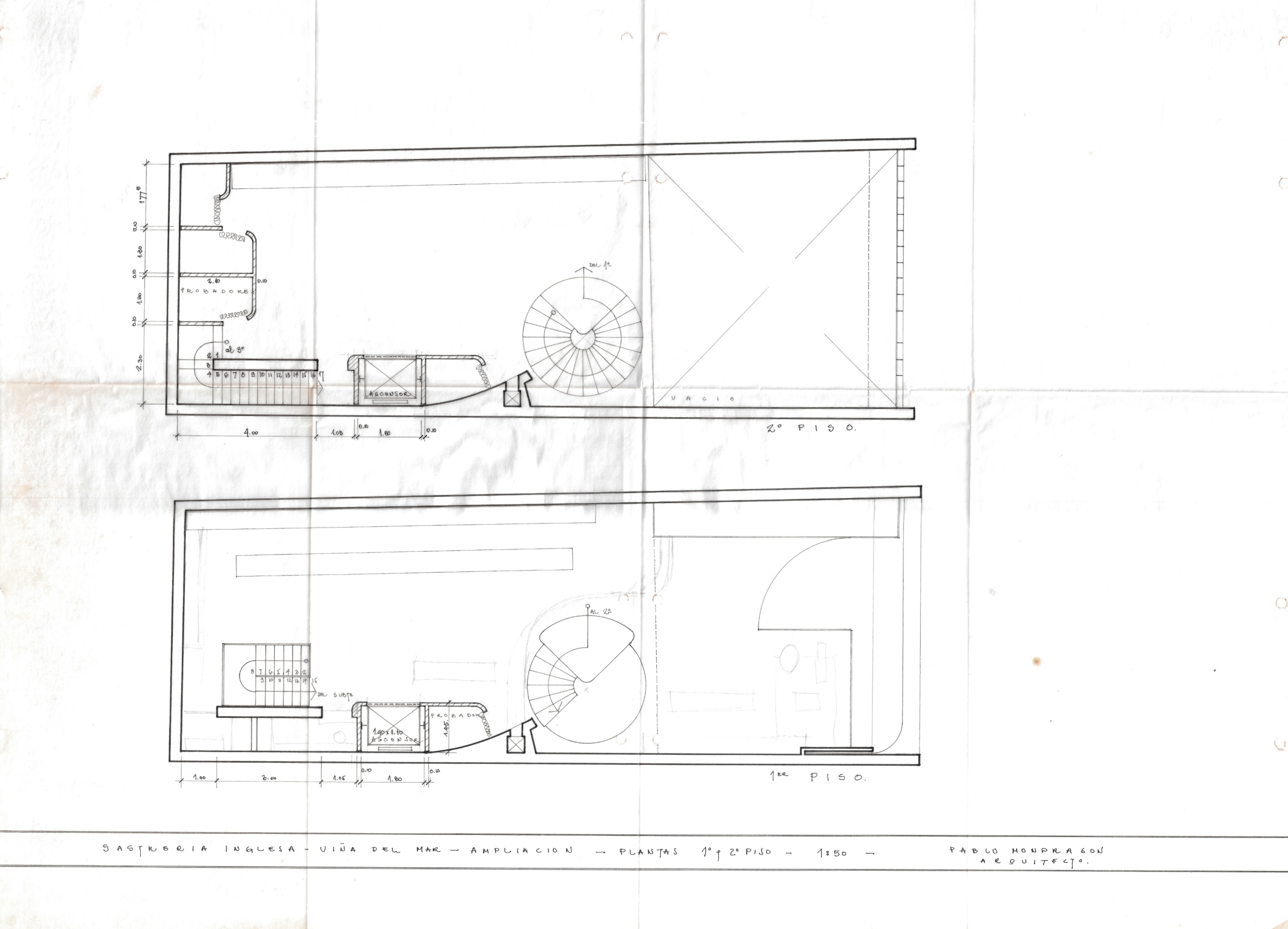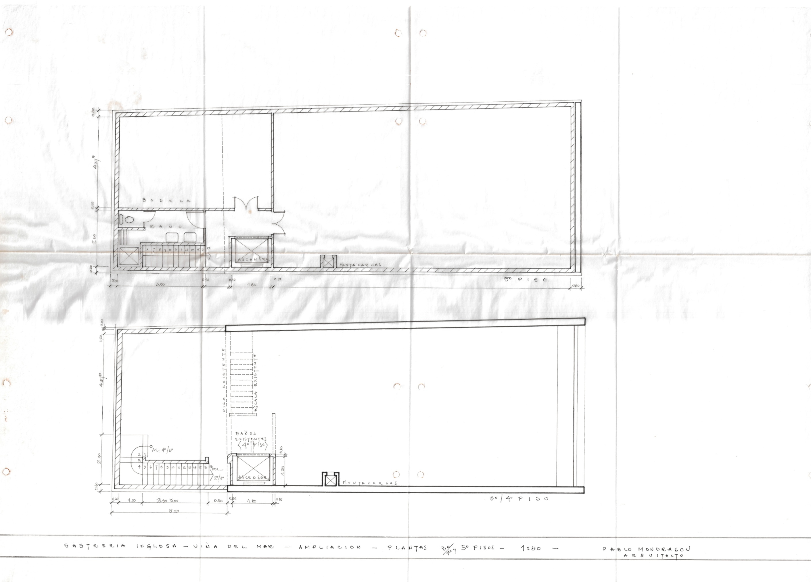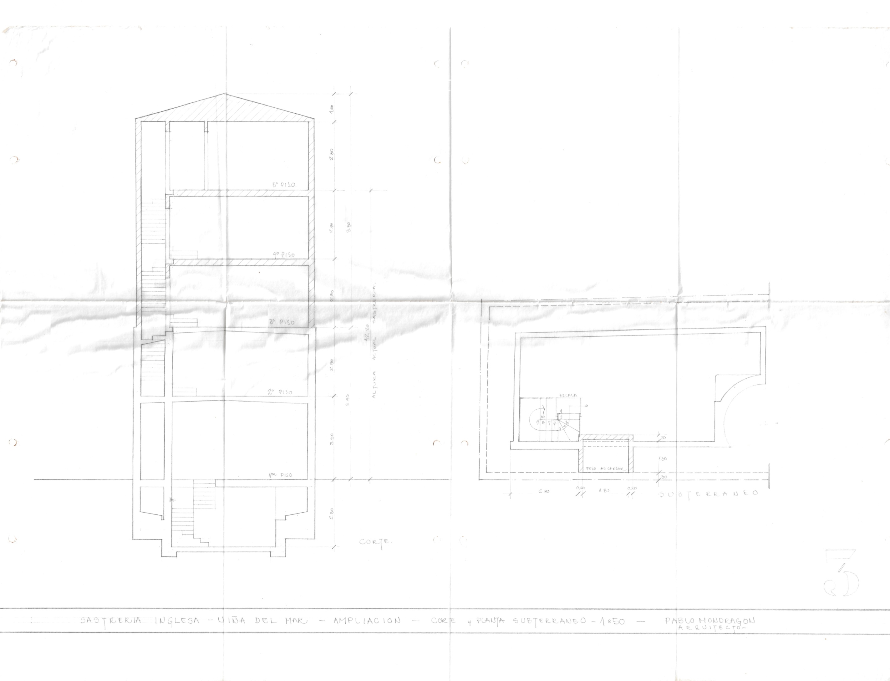 La Sastrería Inglesa, ubicada en la ciudad de Viña del Mar, se compone por un conjunto de planos que registran tanto su configuración original como sus ampliaciones posteriores. El proyecto incluye un plano con las plantas del primer y segundo piso, desarrolladas en escala 1:50. A ello se suman los planos de ampliación que representan las plantas del tercer, cuarto y quinto piso, también en escala 1:50. Finalmente, el conjunto incorpora un plano adicional de ampliación que muestra el corte general del edificio y la planta del subterráneo, igualmente elaborados en escala 1:50, completando así la documentación arquitectónica integral del inmueble.