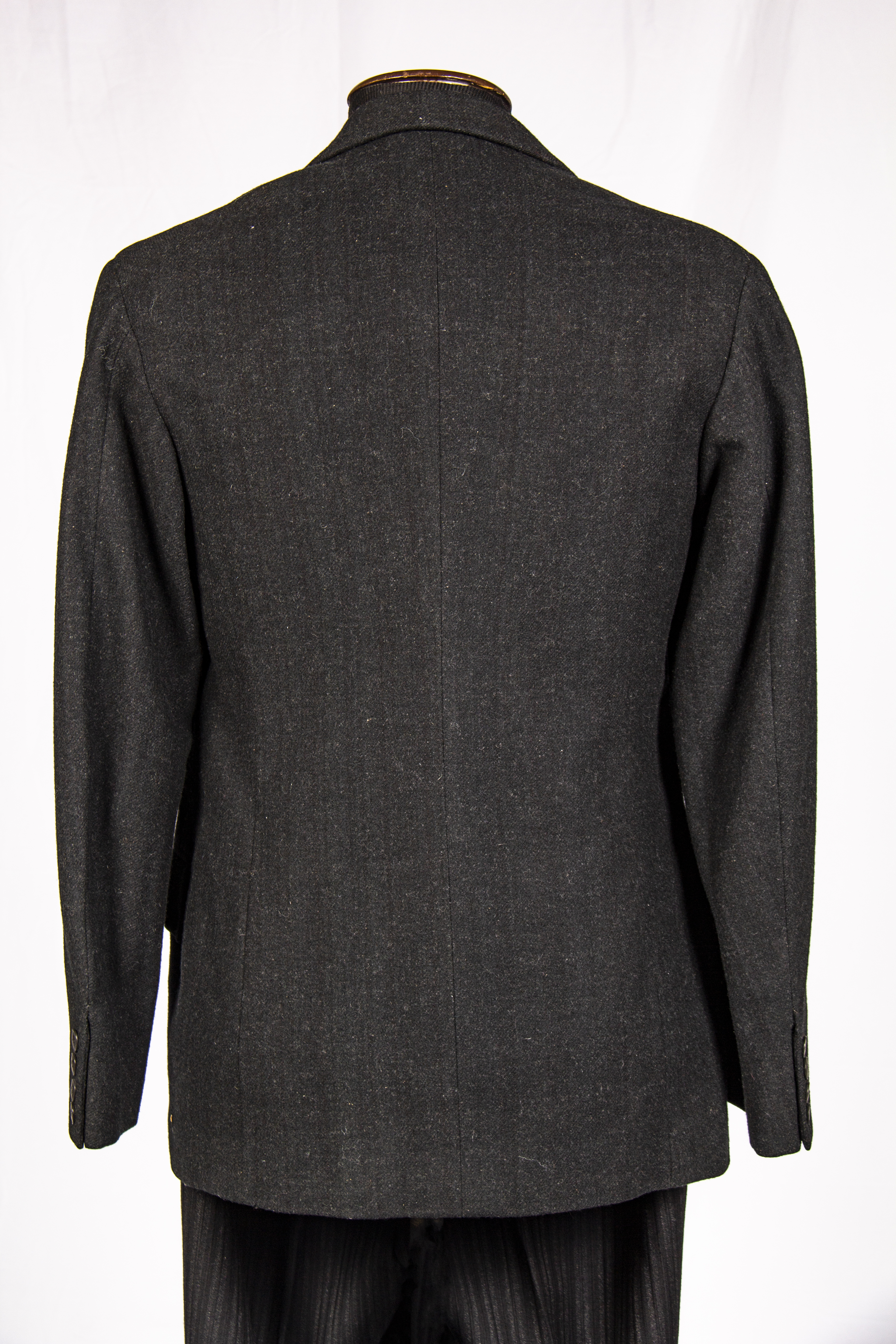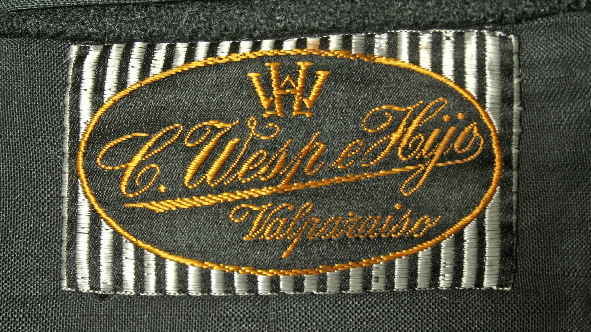 Traje de dos piezas, chaqueta negra cruzada, con 4 botones y bolsillos con solapa, pantalón listado marca 'C. Wesp e hijos' , Valparaíso. Fabricación chilena.