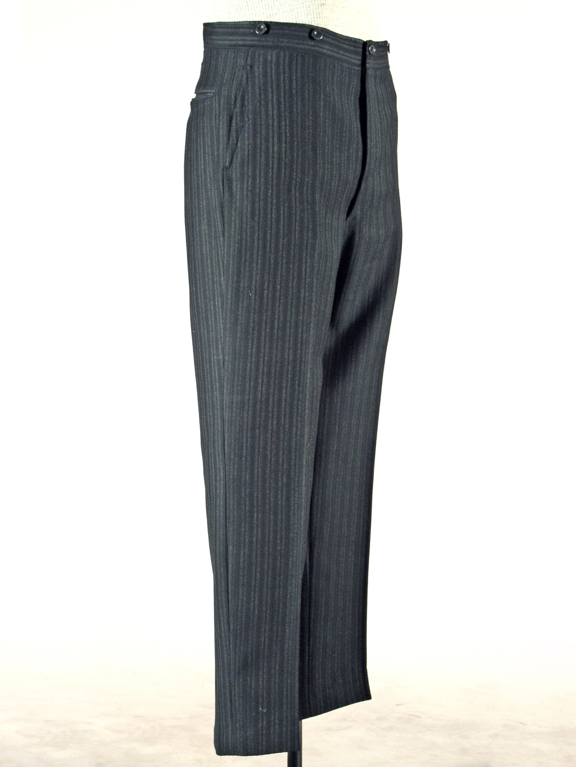Two-piece suit, black double-breasted jacket with 4 buttons and flap pockets, striped trousers, brand 'C. Wesp e hijos,' Valparaíso. Chilean manufacture.