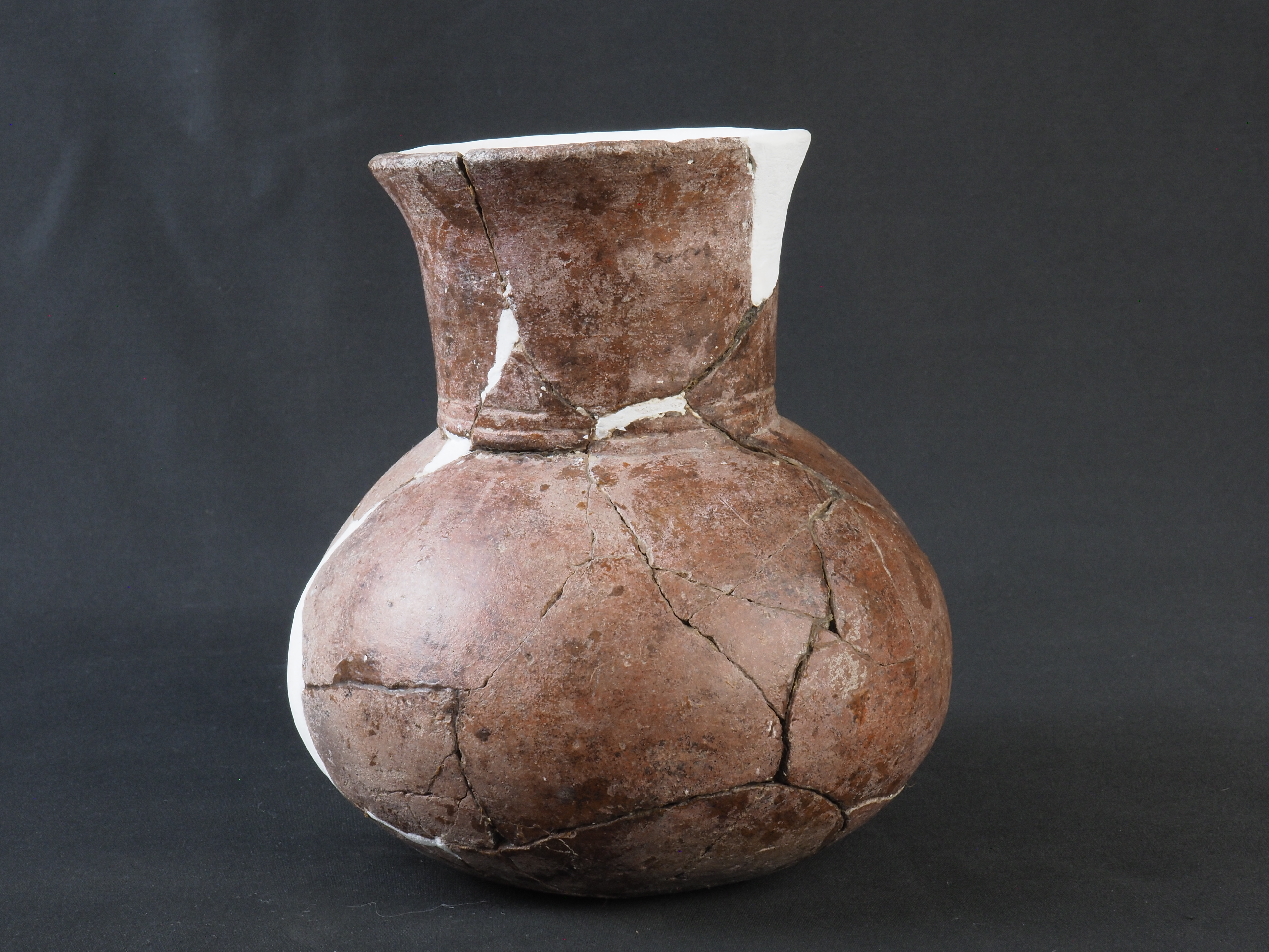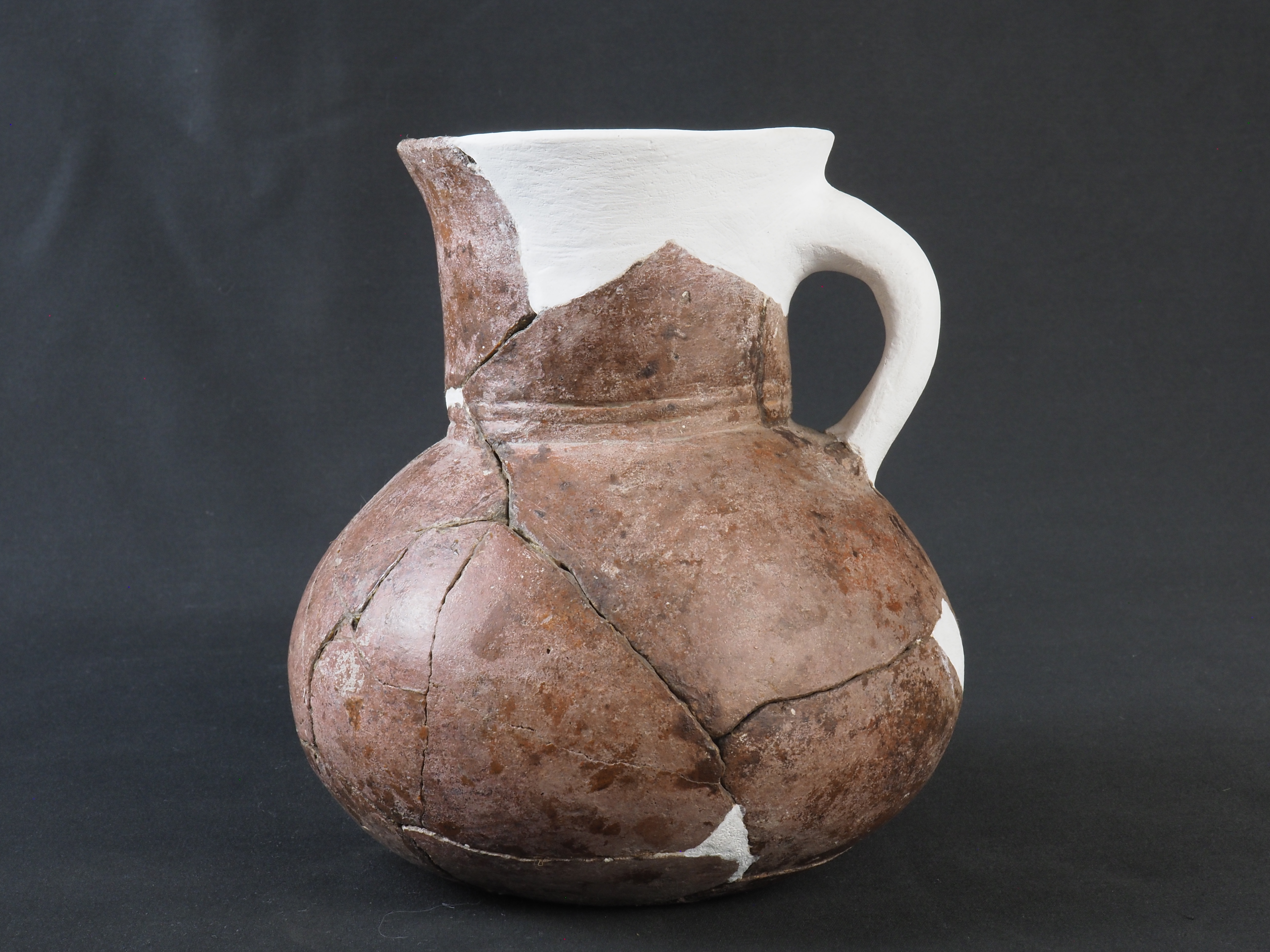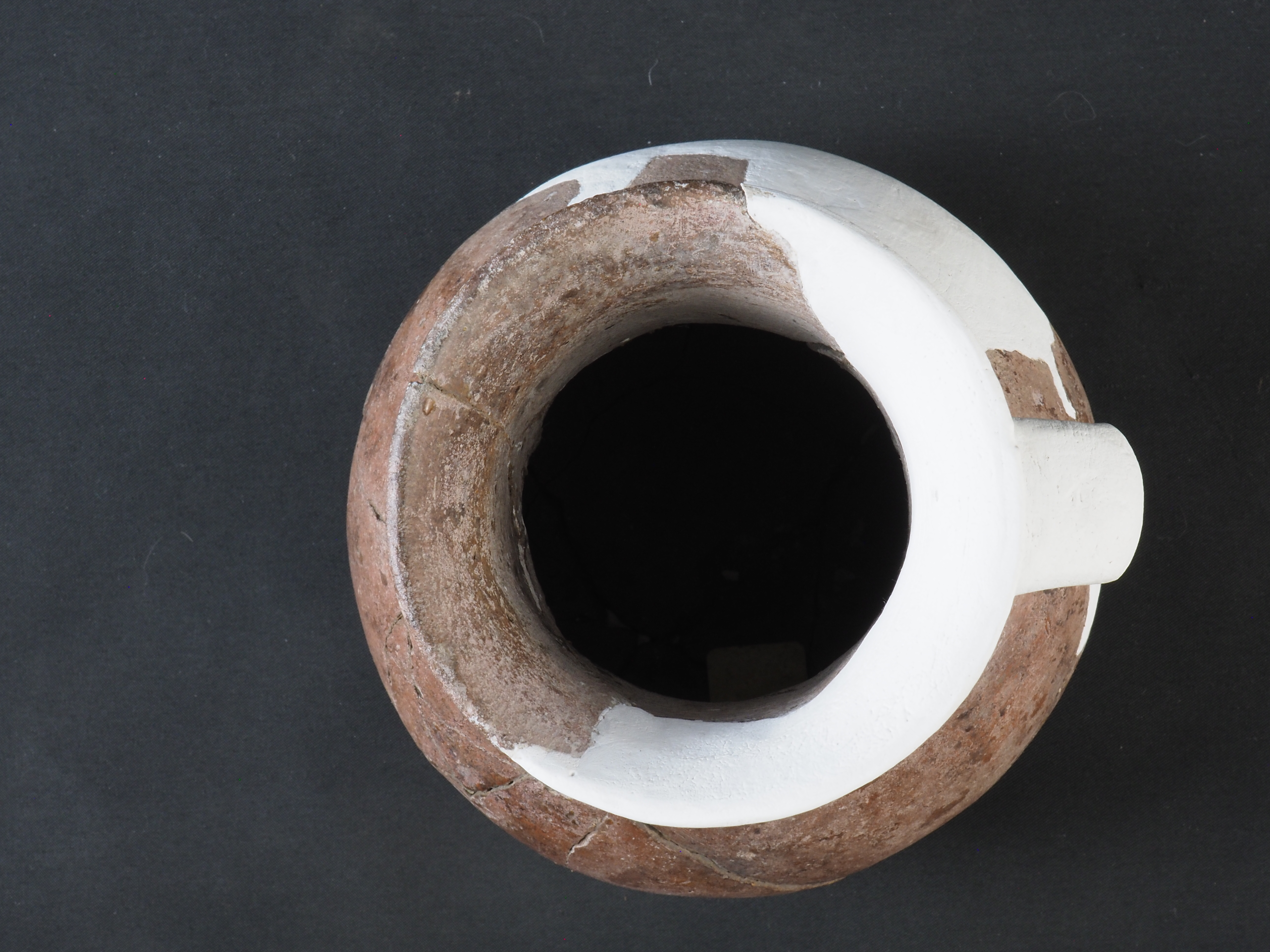 Contenedor de uso doméstico y/o ritual, monócromo. Posee decoración en bajo relieve en sección inferior del cuello en forma de dos líneas horizontales. Técnica: Arcilla modelada, alisada, pulida y bruñida. Morfología: Objeto asimétrico, de estructura restringida con cuello, de perfil compuesto, cuerpo esférico, borde evertido, labio redondeado, base plana. Posee un asa cinta dispuesta verticalmente desde el labio hasta el cuerpo. Presenta reintegración cromática realizada con yeso blanco en cuello, borde y la totalidad del asa.