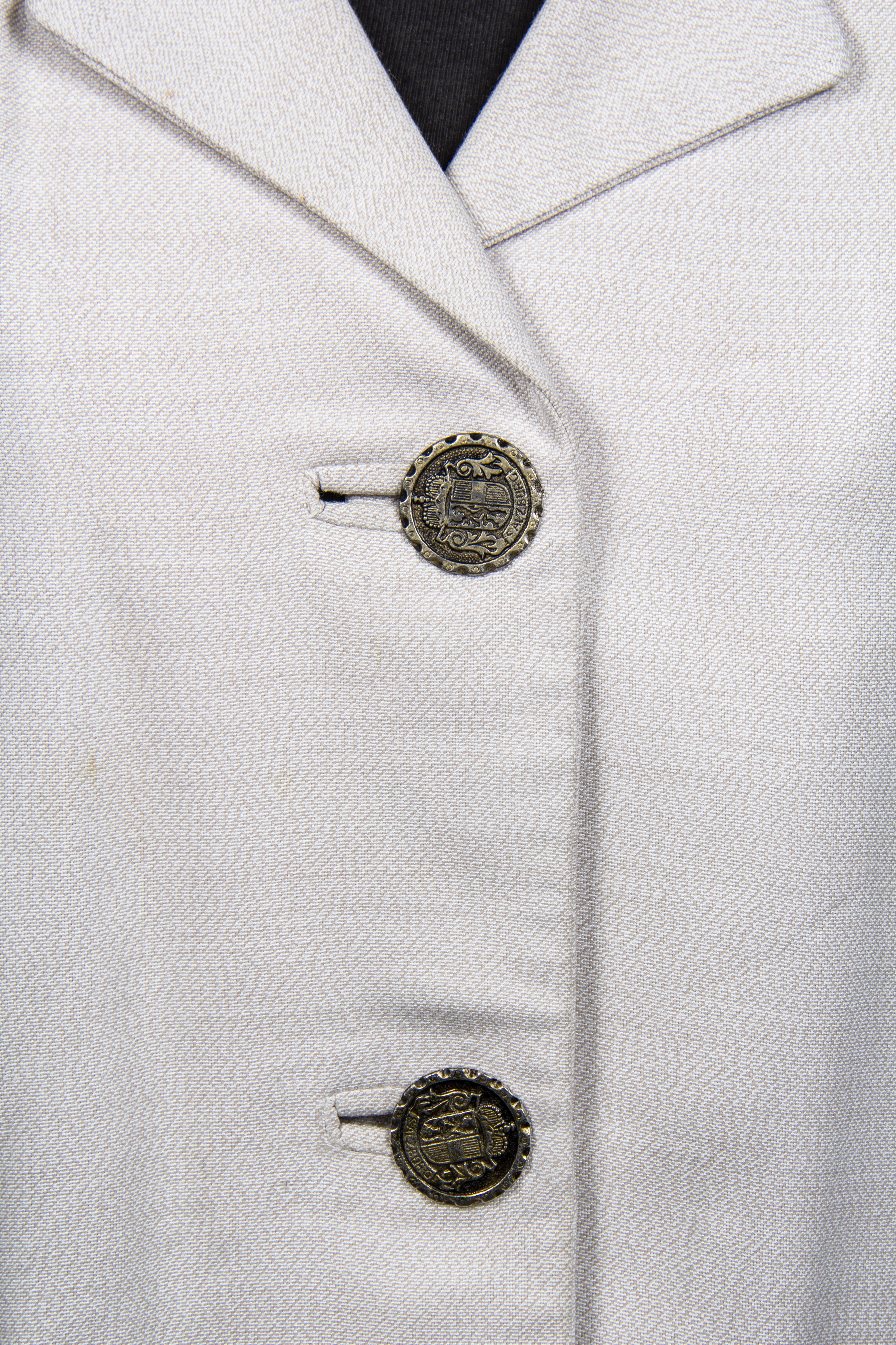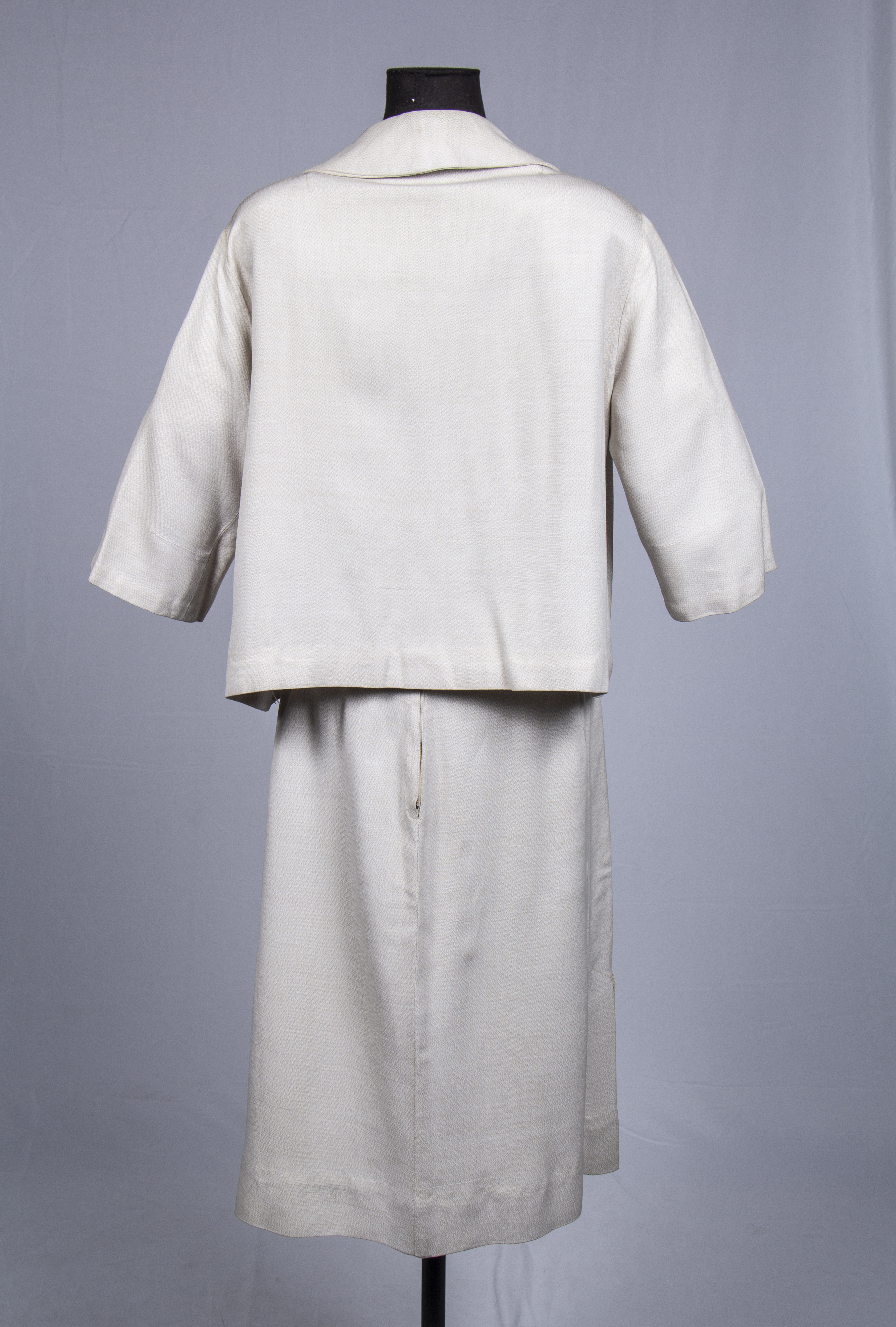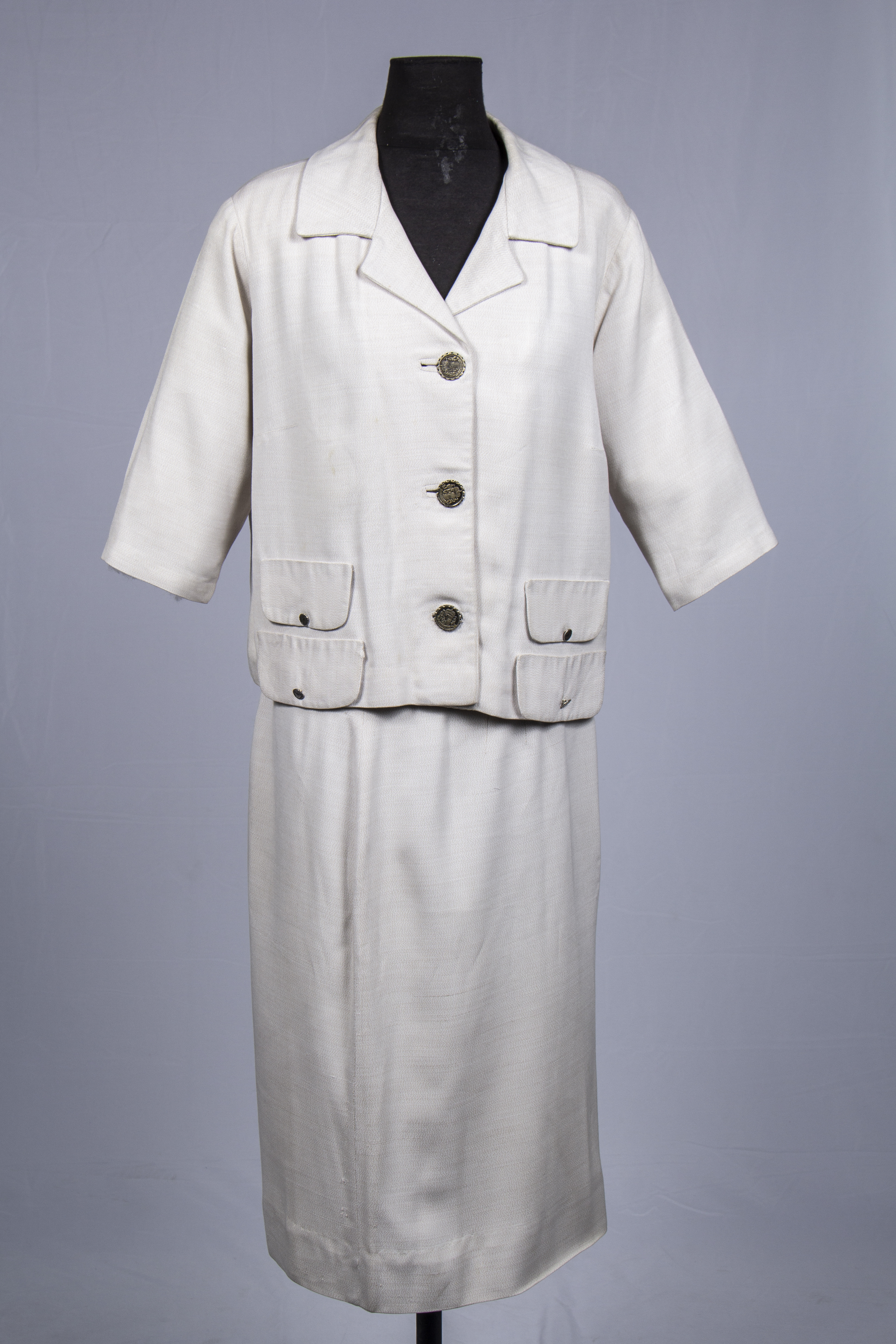Two-piece Italian linen suit tailored in Valparaíso by Mercedes Ewoldt, who wore it at her religious wedding ceremony at the Twelve Apostles Church in Valparaíso.