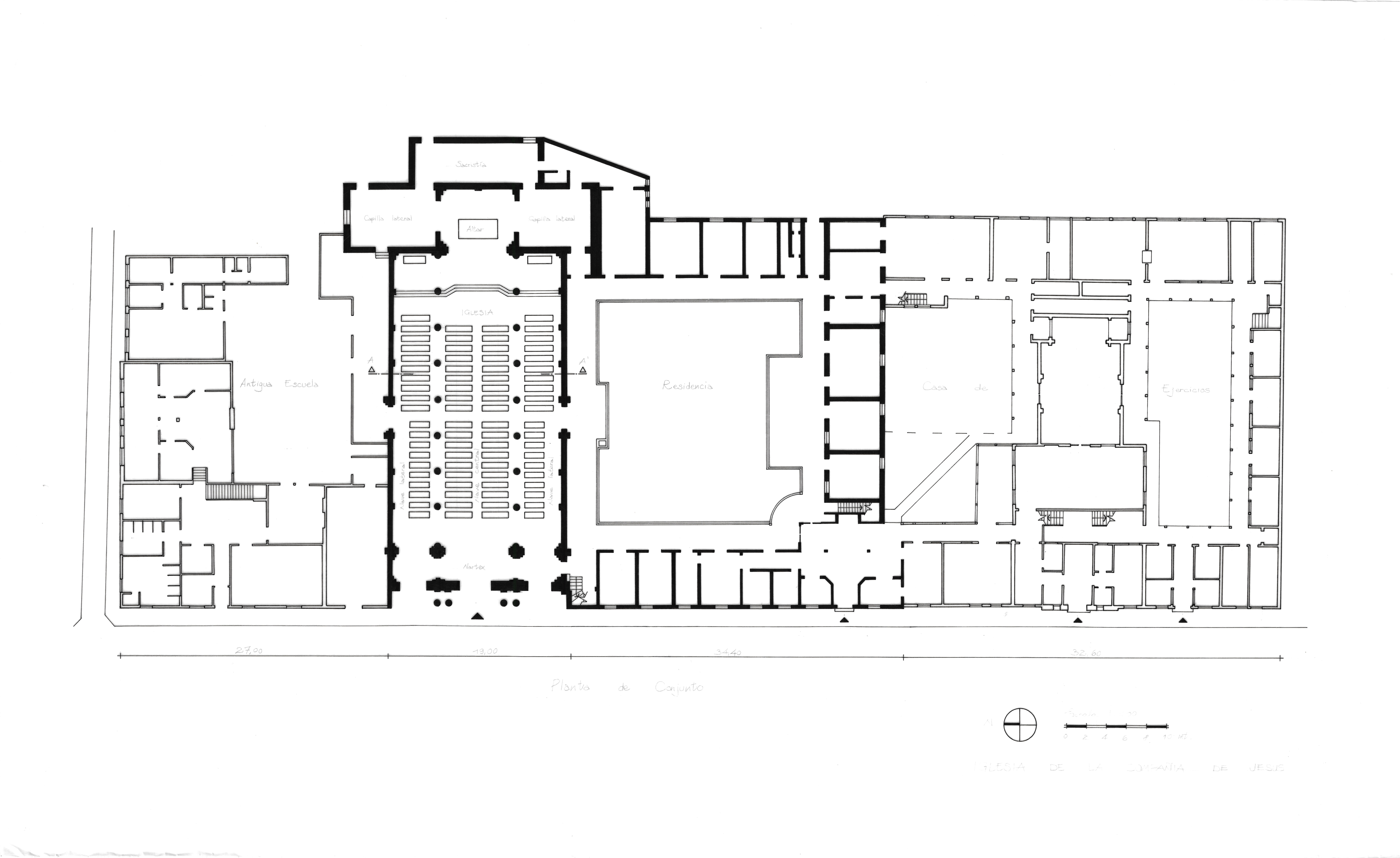 Lámina n° 1: planta de conjunto, escala 1:200. Lámina n° 2: corte A-A, escala 1:100. Lámina 3: elevación iglesia, escala 1:100. Lámina n°4: fachada iglesia y residencia, escala 1:100.