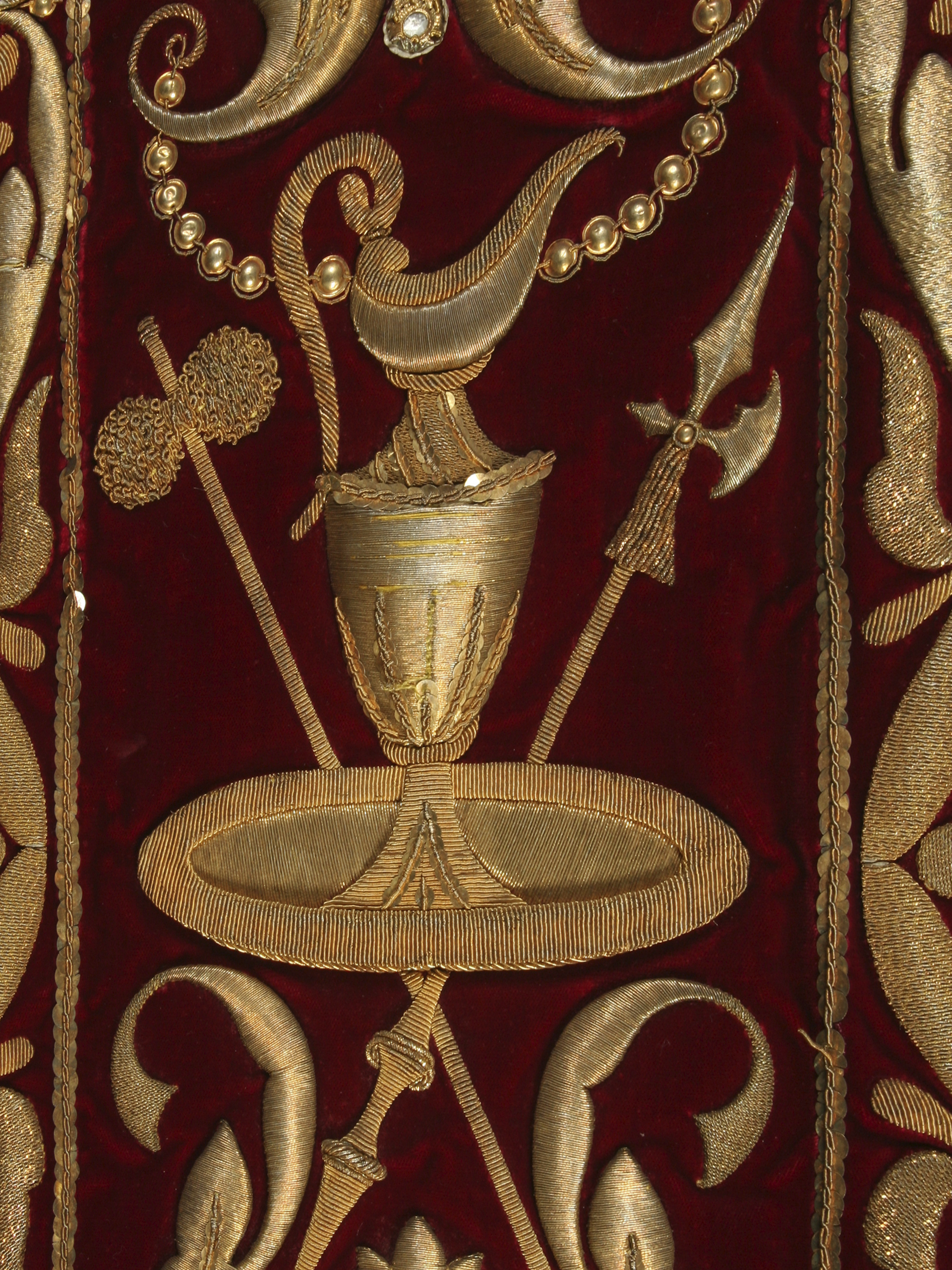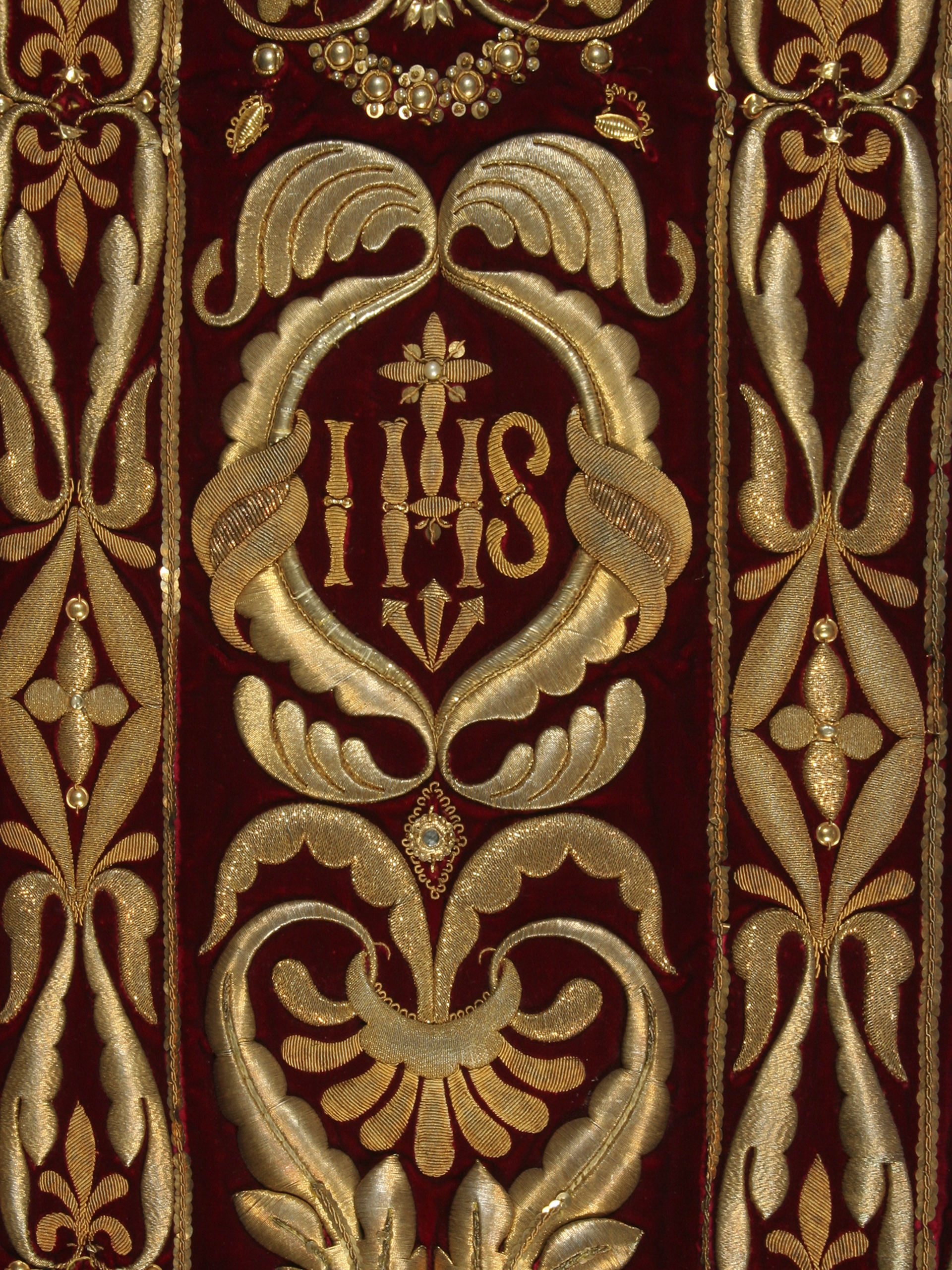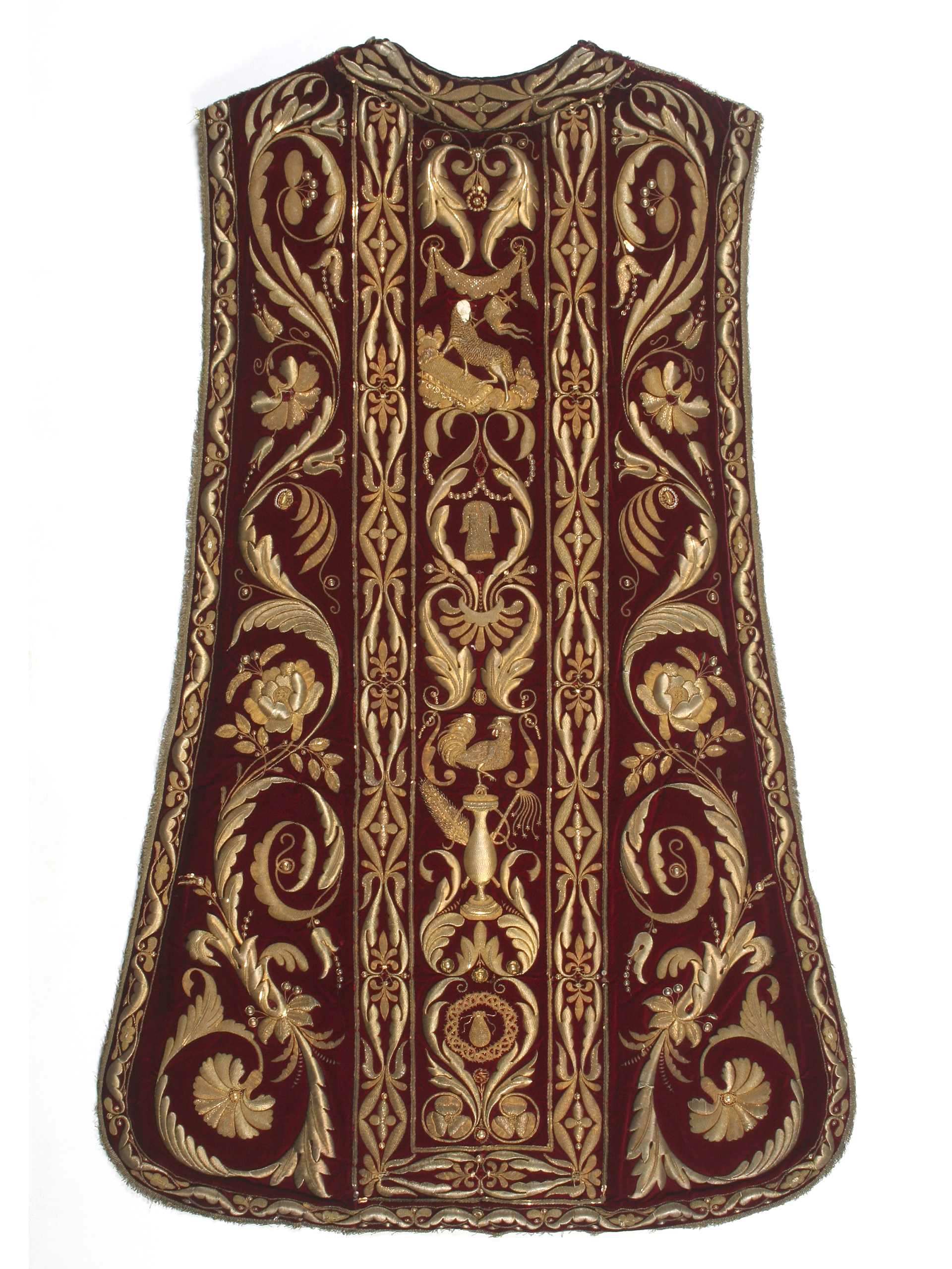Red Chasuble, plush, metallic embroidered relief floral motifs, red inner lining.