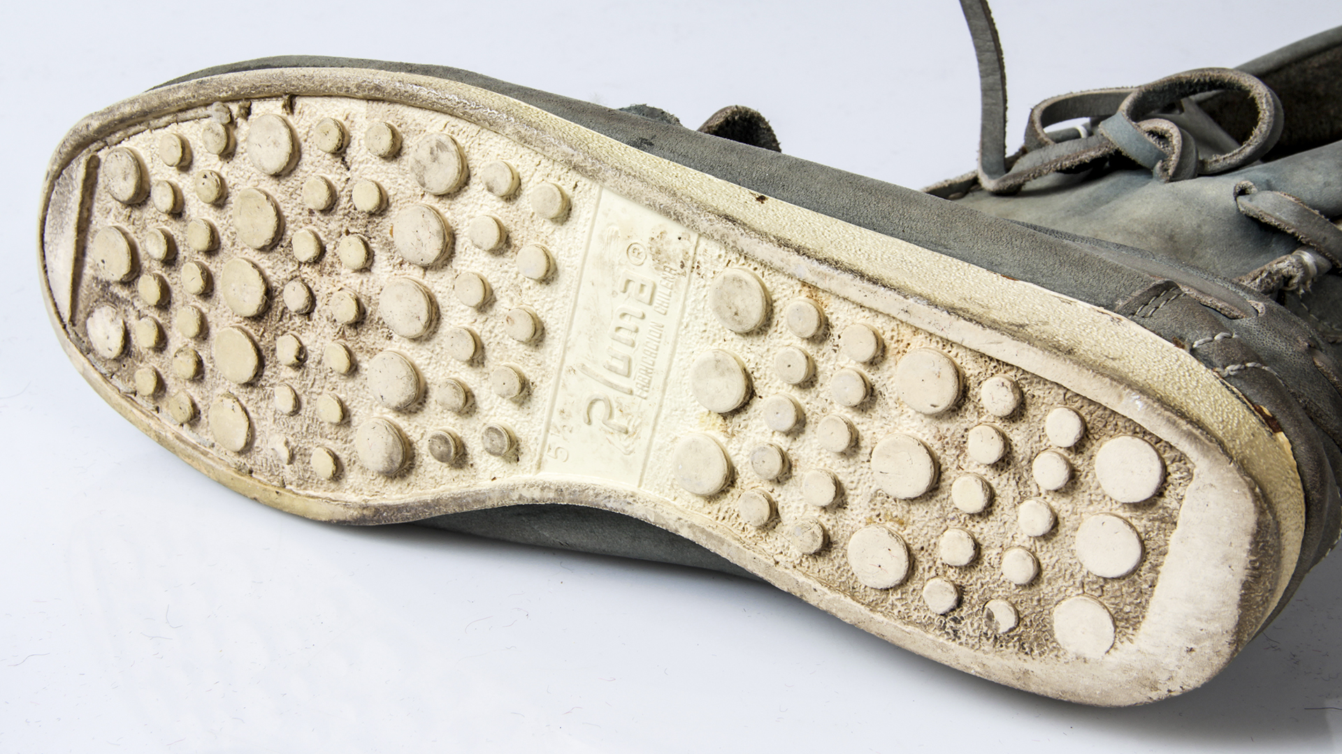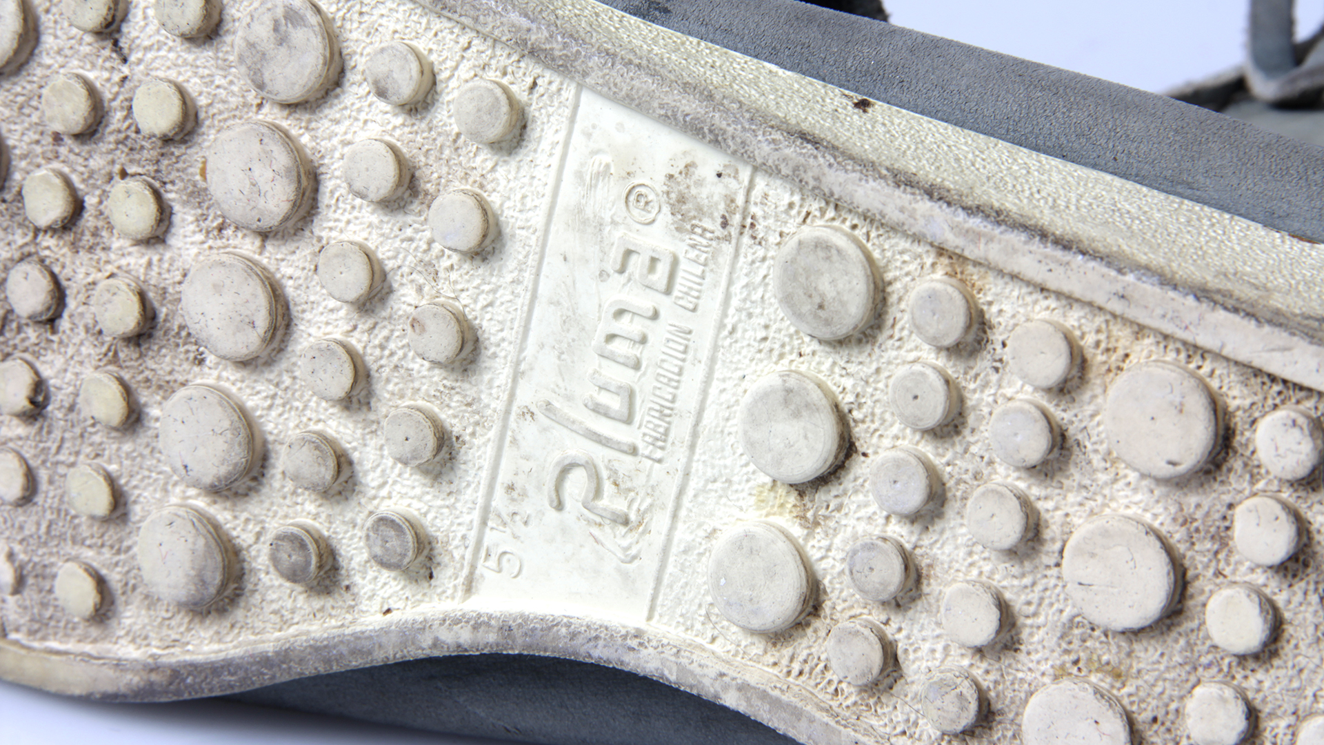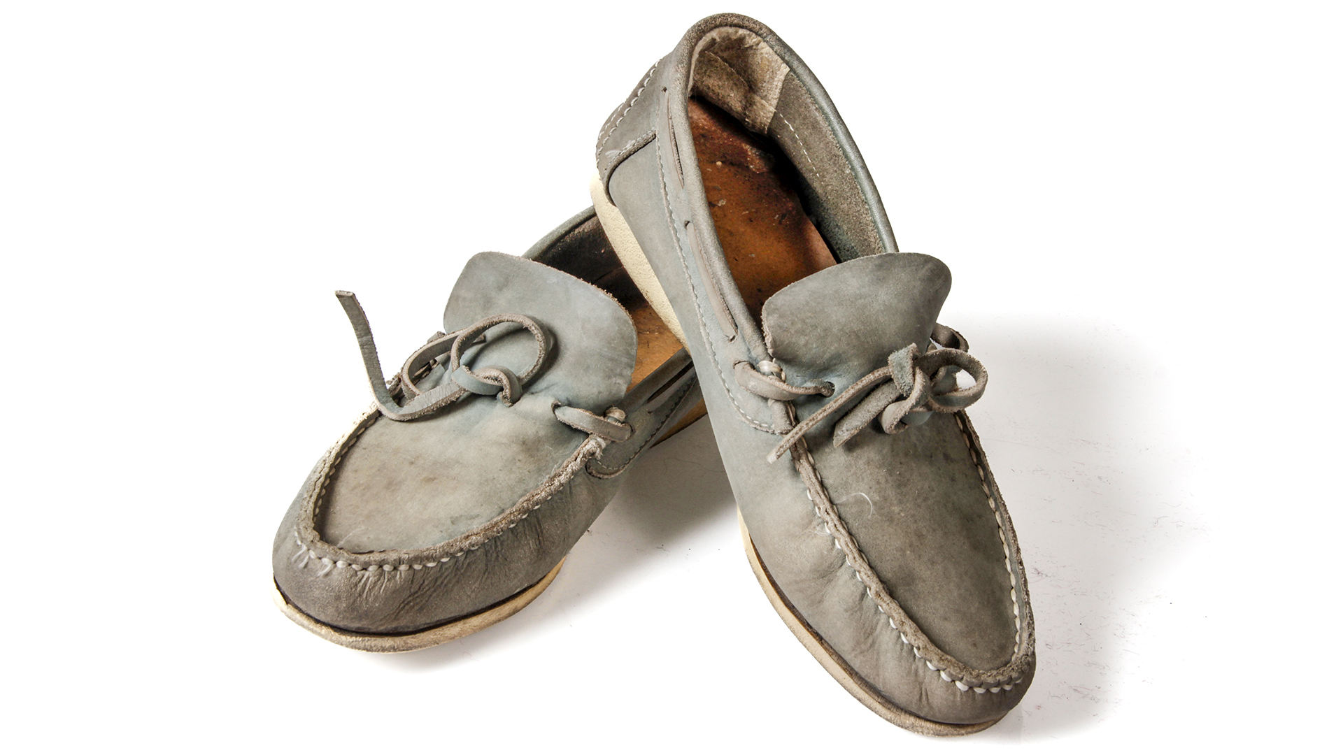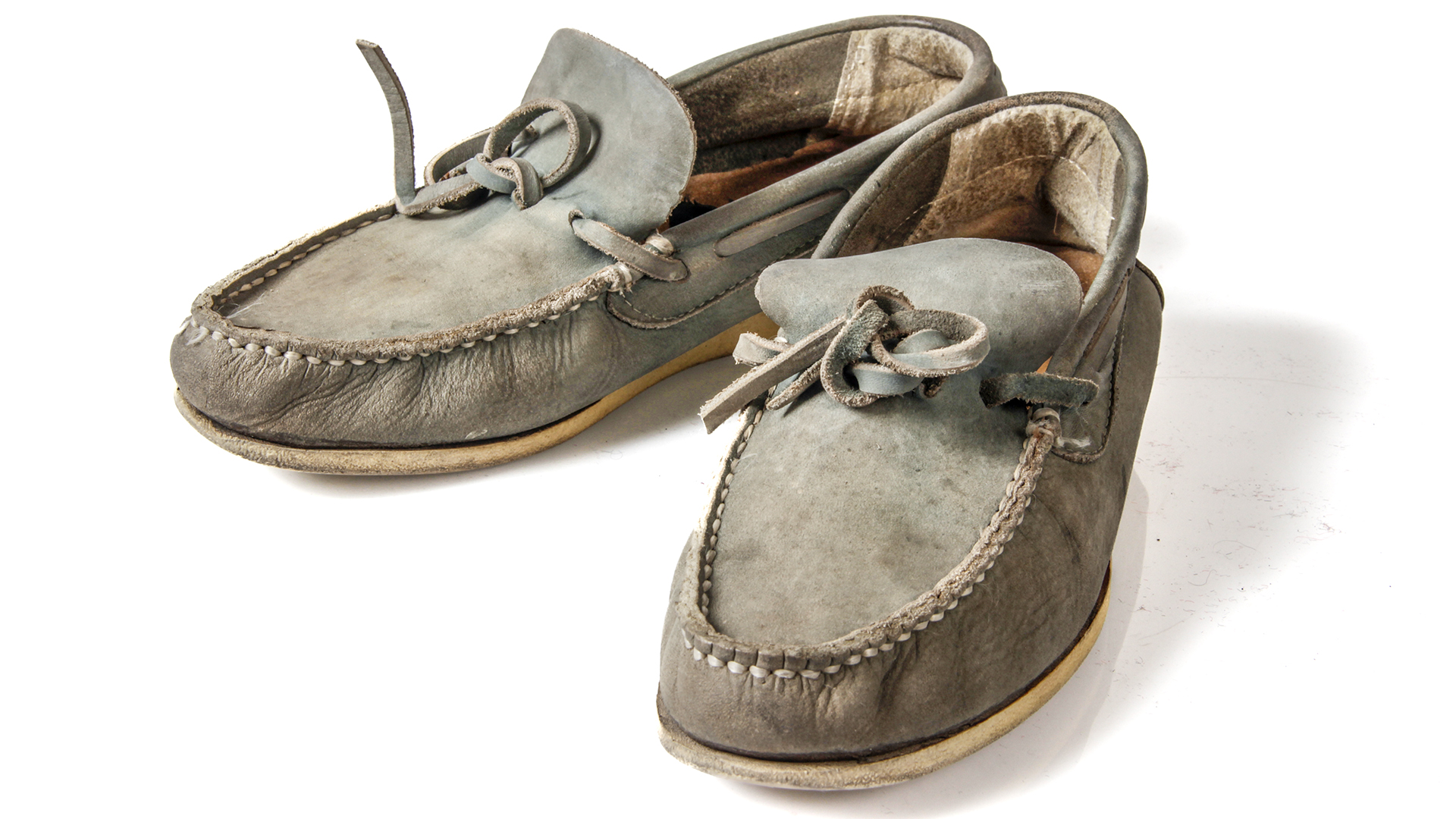 Mocasines de mujer, cuero color gris, cordón ornamental en empeine, número 5 1/2, marca Pluma, fabricación chilena de la década de los 90.