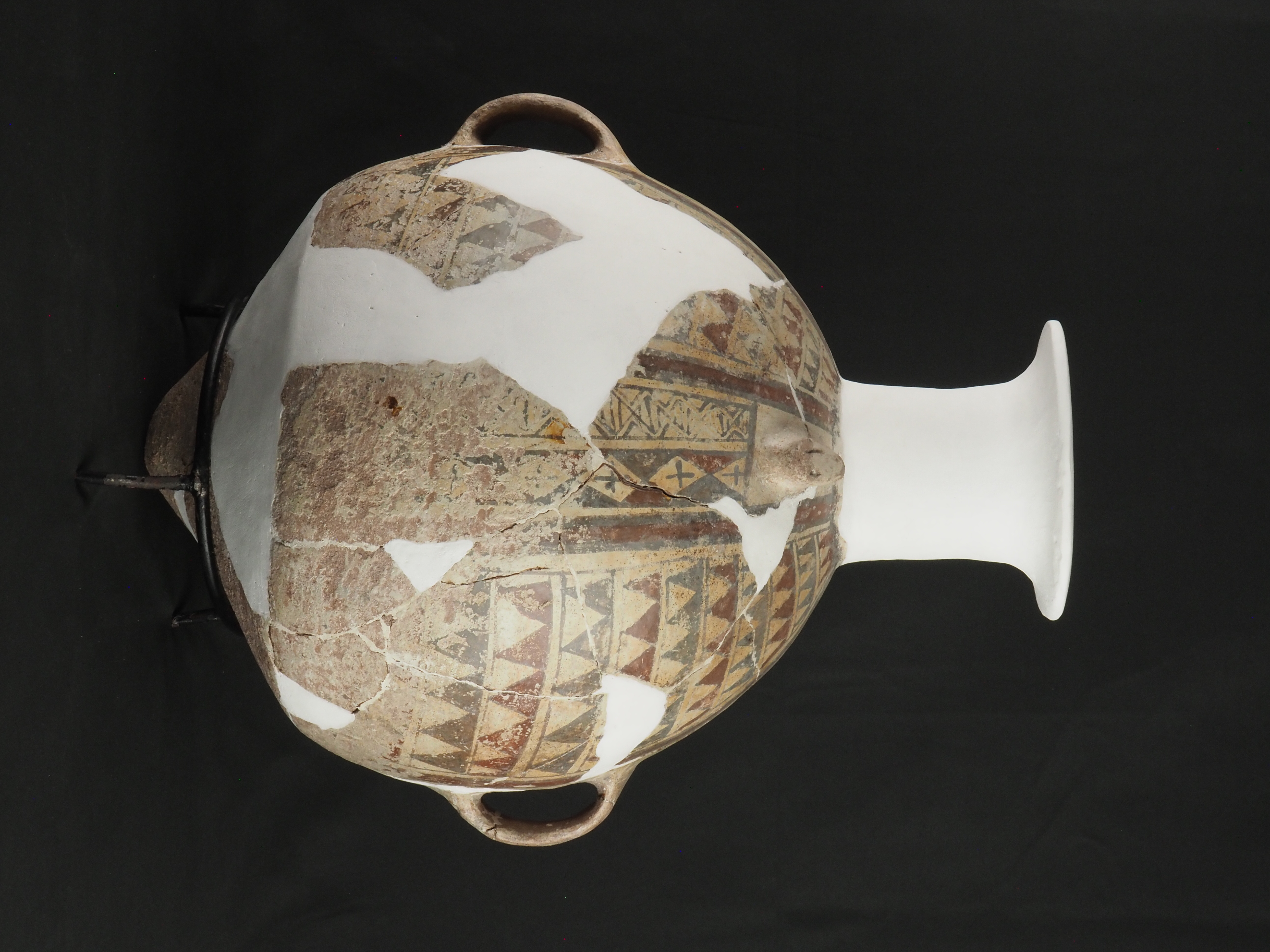 Objeto tipo aríbalo de 27,3 cm x 25,2 cm x 18, 6 cm. Se evidencia intervenciones anteriores relativas a unión de fragmentos con adhesivos desconocidos y reintegración volumétrica con yeso blanco. El objeto original se presenta en fragmentos unidos, siendo un universo del 60% aproximado del objeto total. El % restante considera reintegración volumétrica y una representación en yeso de un cuello con borde evertido hipotético. El estado de conservación de los fragmentos originales se considera bueno aún cuando se evidencia desgaste en la base y el cuerpo por uso. Técnica: Arcilla modelada, alisada, pulida, bruñida. Morfología: Objeto simétrico, restringido con cuello. De perfil complejo, cuerpo ovoide, cuello hiperboloide, borde evertido y labio redondeado. Base convexa cónica. Posee dos asas de arco lisas, sección subcircular emplazadas en el cuerpo y un protúbero.