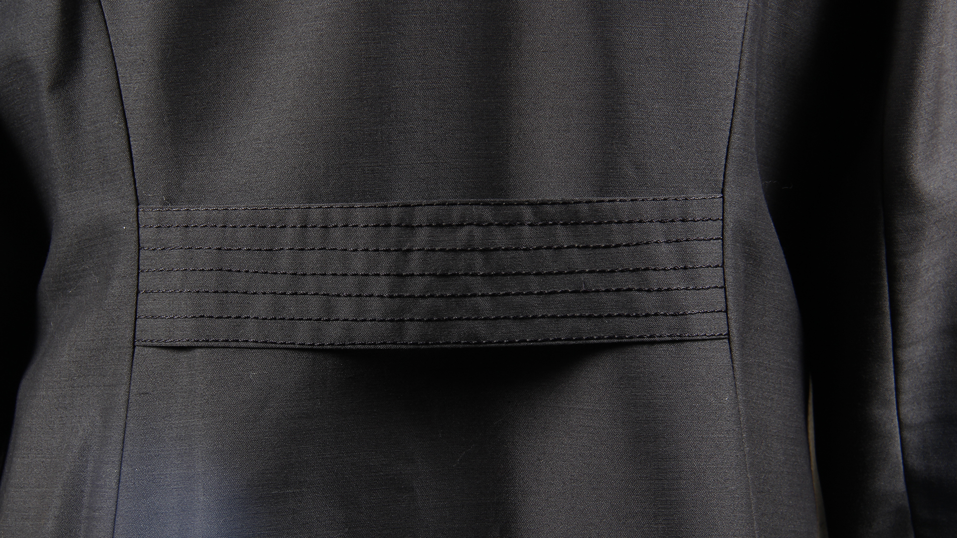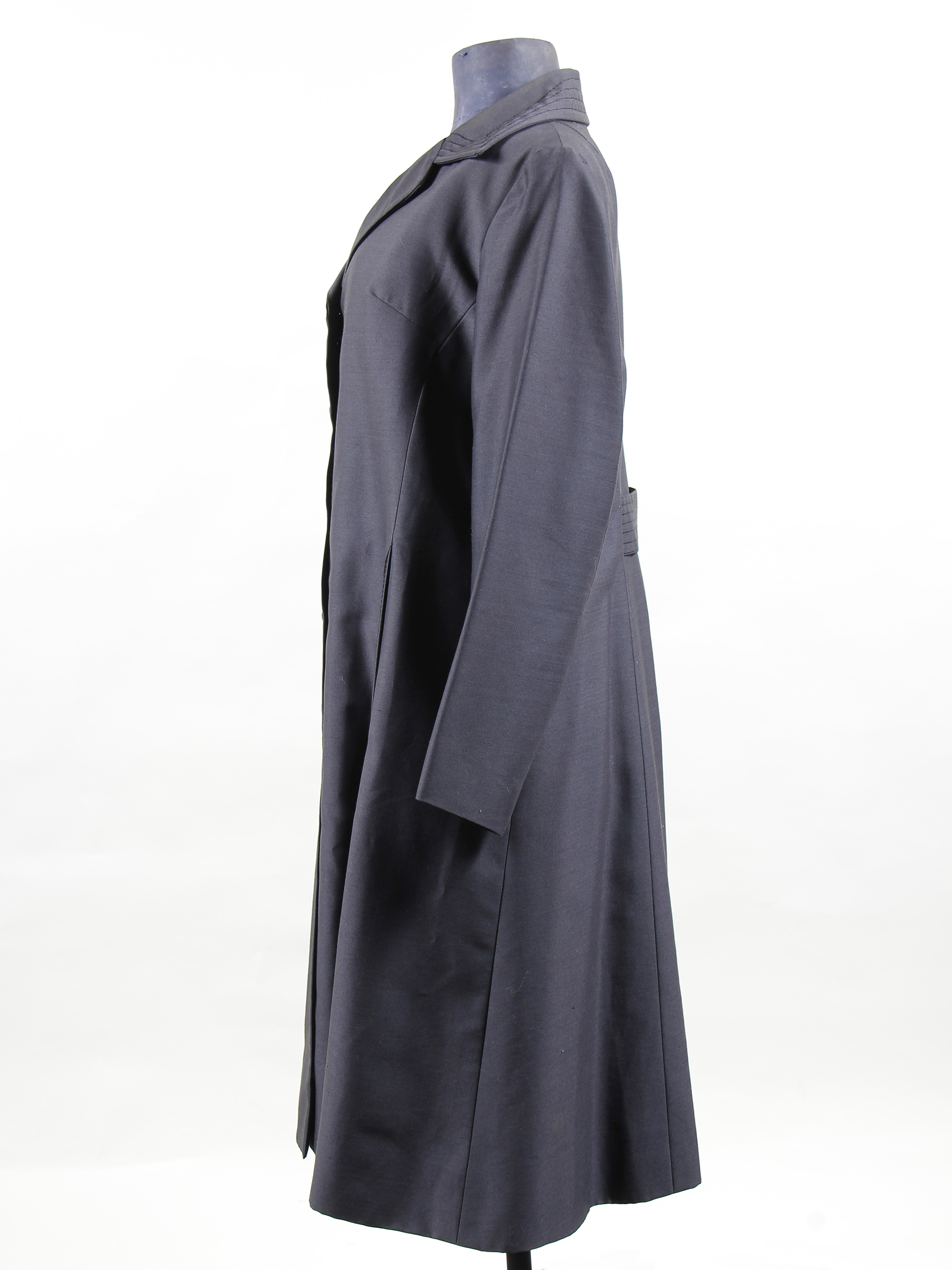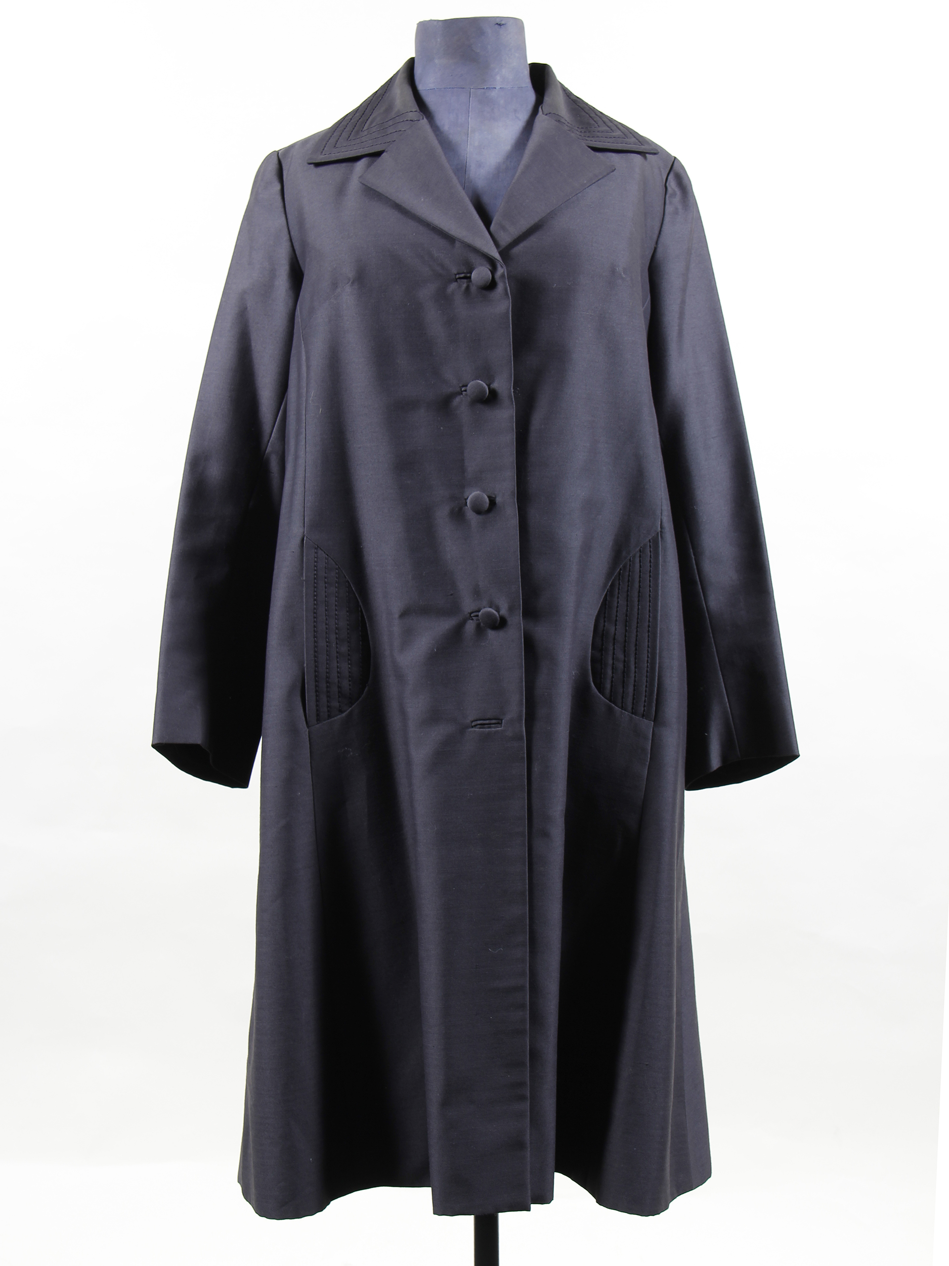 Woman's shantung fabric coat, black in color. 4 covered buttons (1 missing). Front pockets and back stripe with straight stitch seams. Label reads 'Viena Style.' Made in Chile.