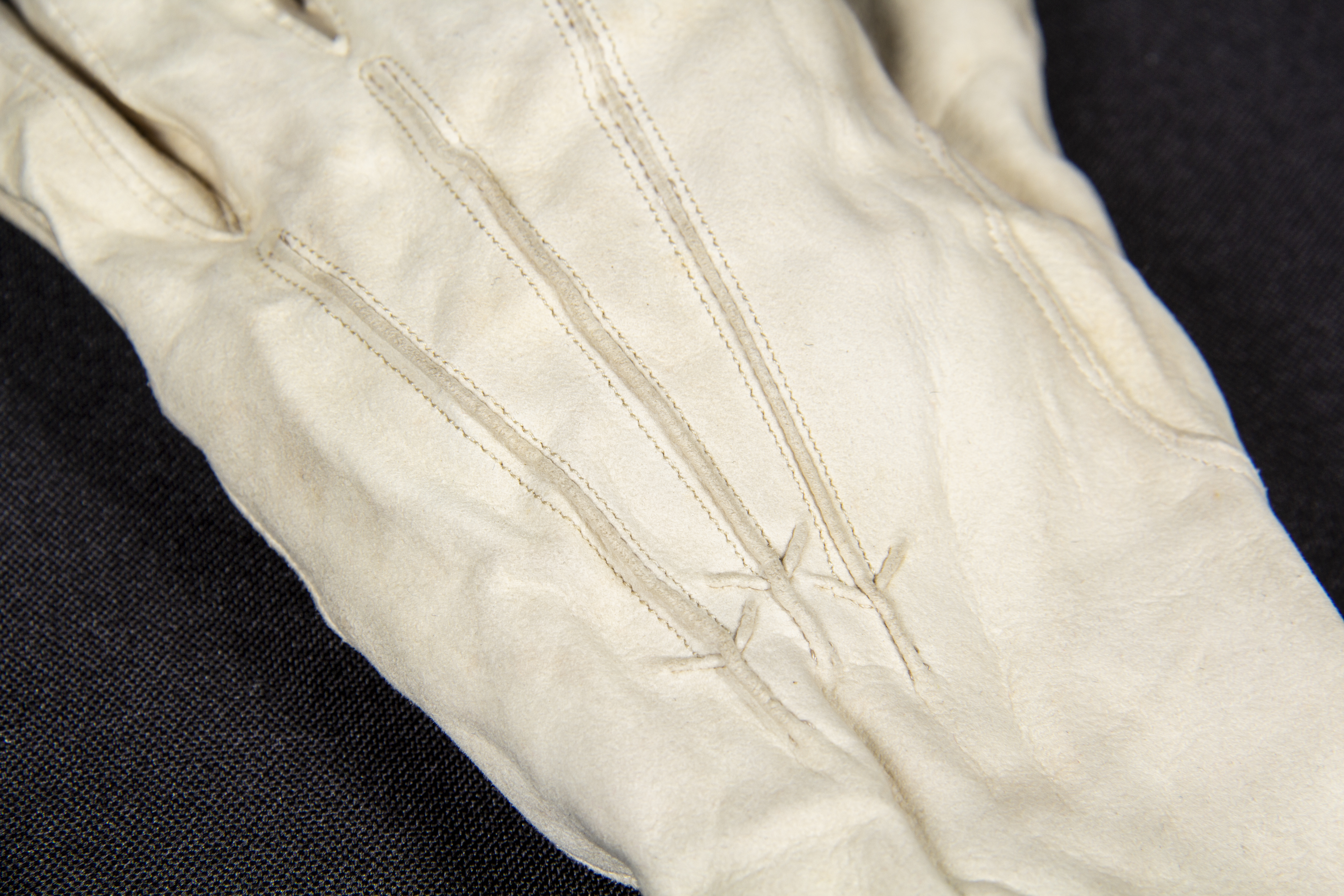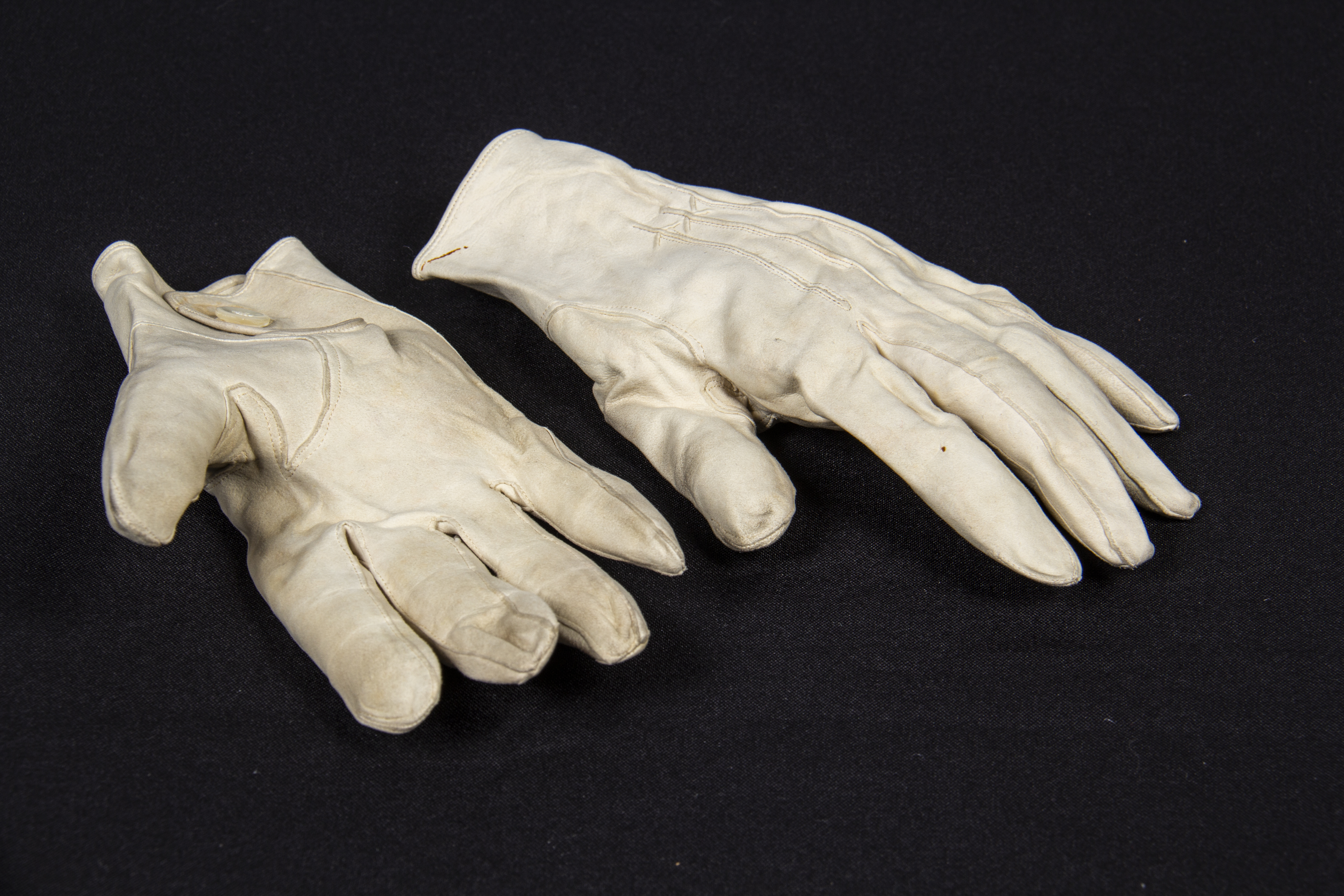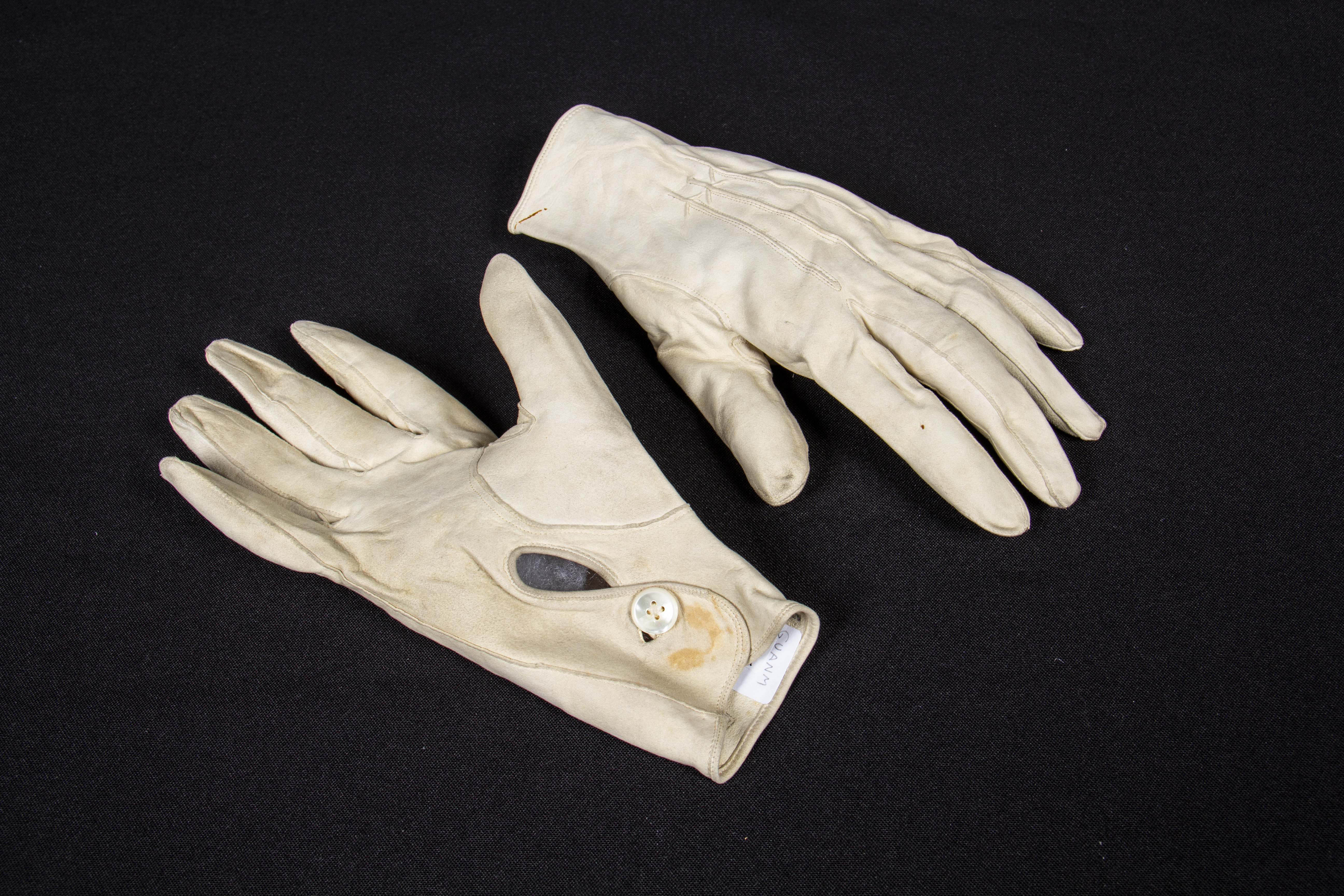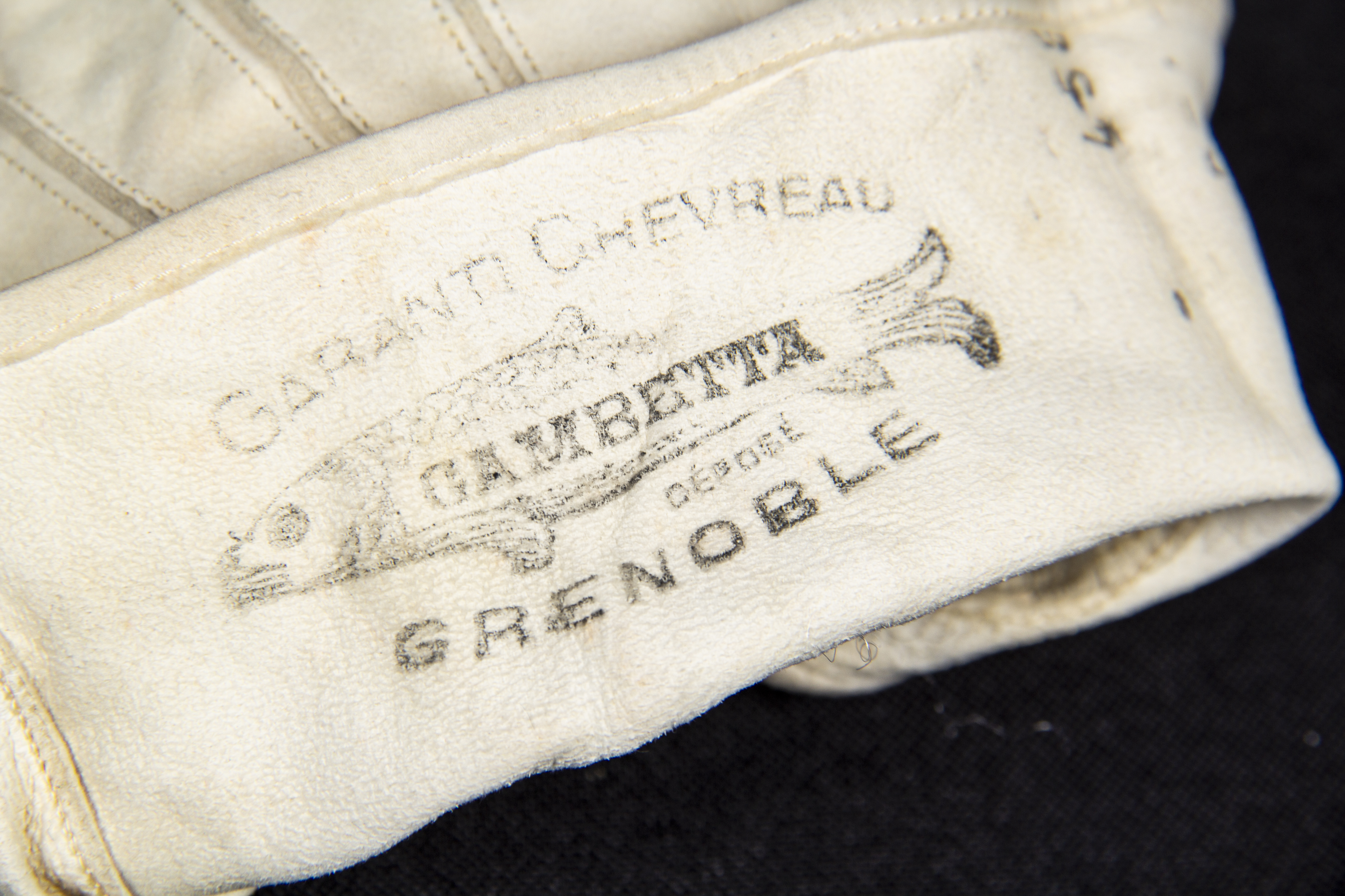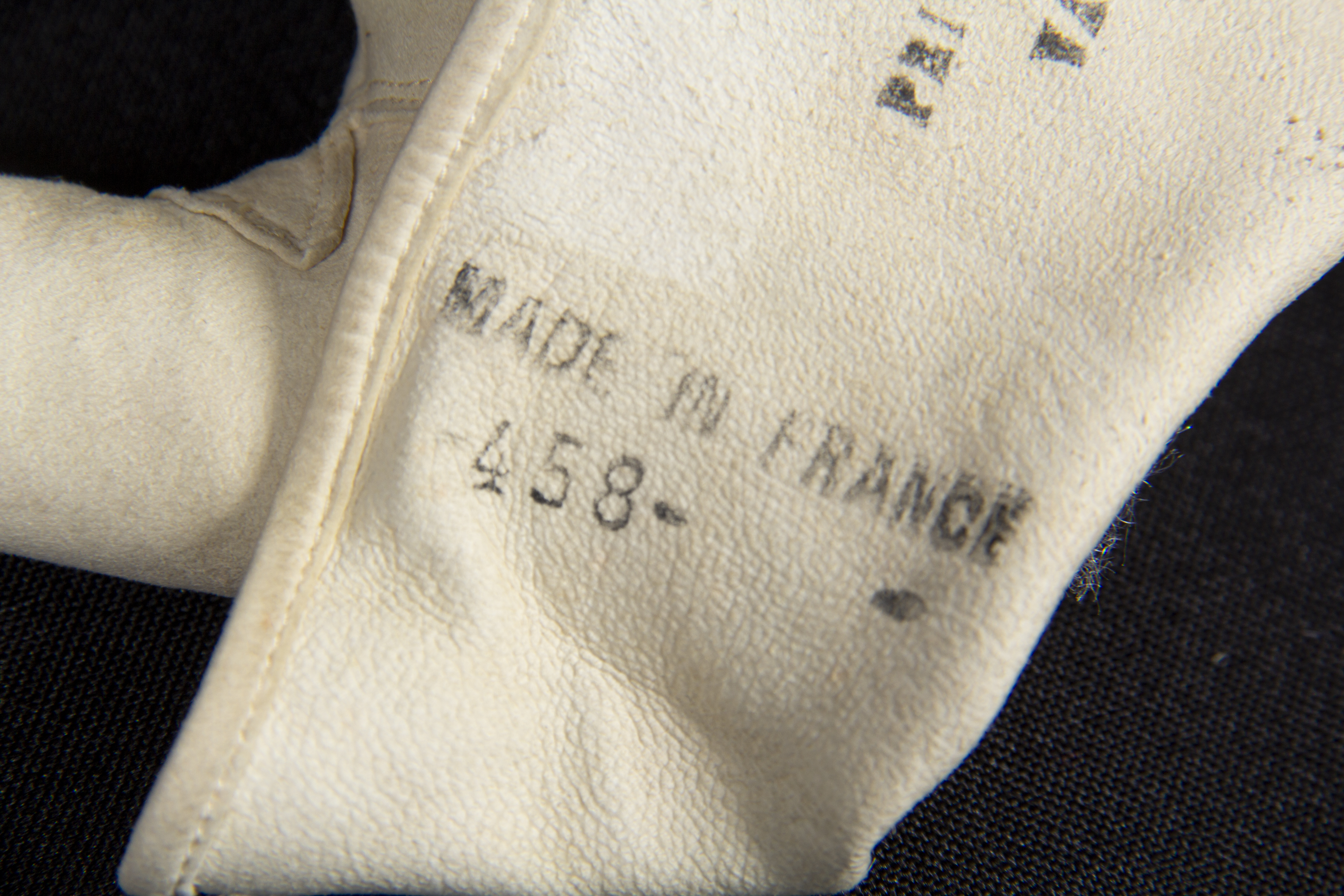 Guantes cortos de gamuza blanco invierno, con un botón en la muñeca. Fabricación francesa, marca Gambetra - Grenoble' Garanti Chevreau. Prince of Wales. Valparaíso.