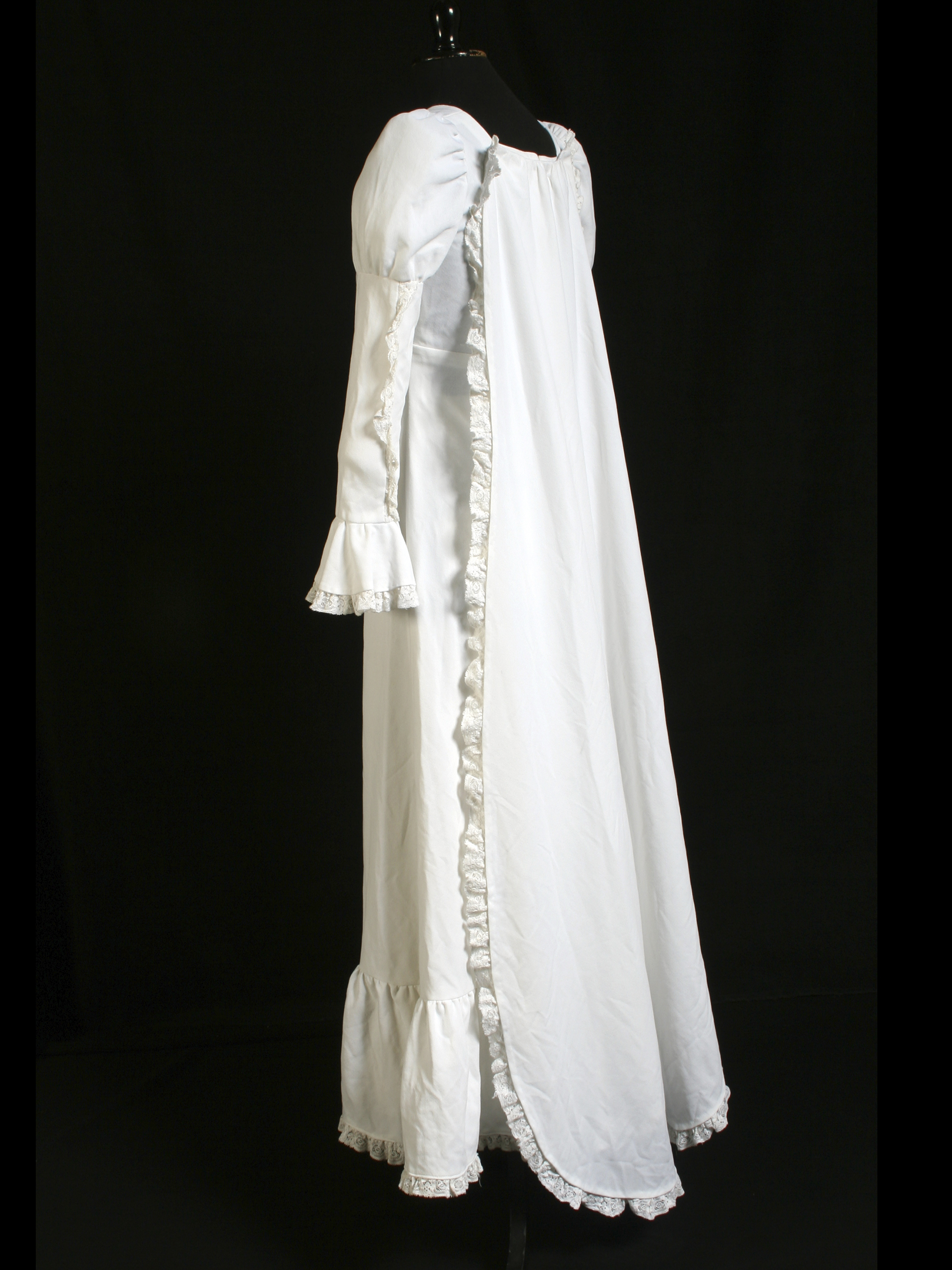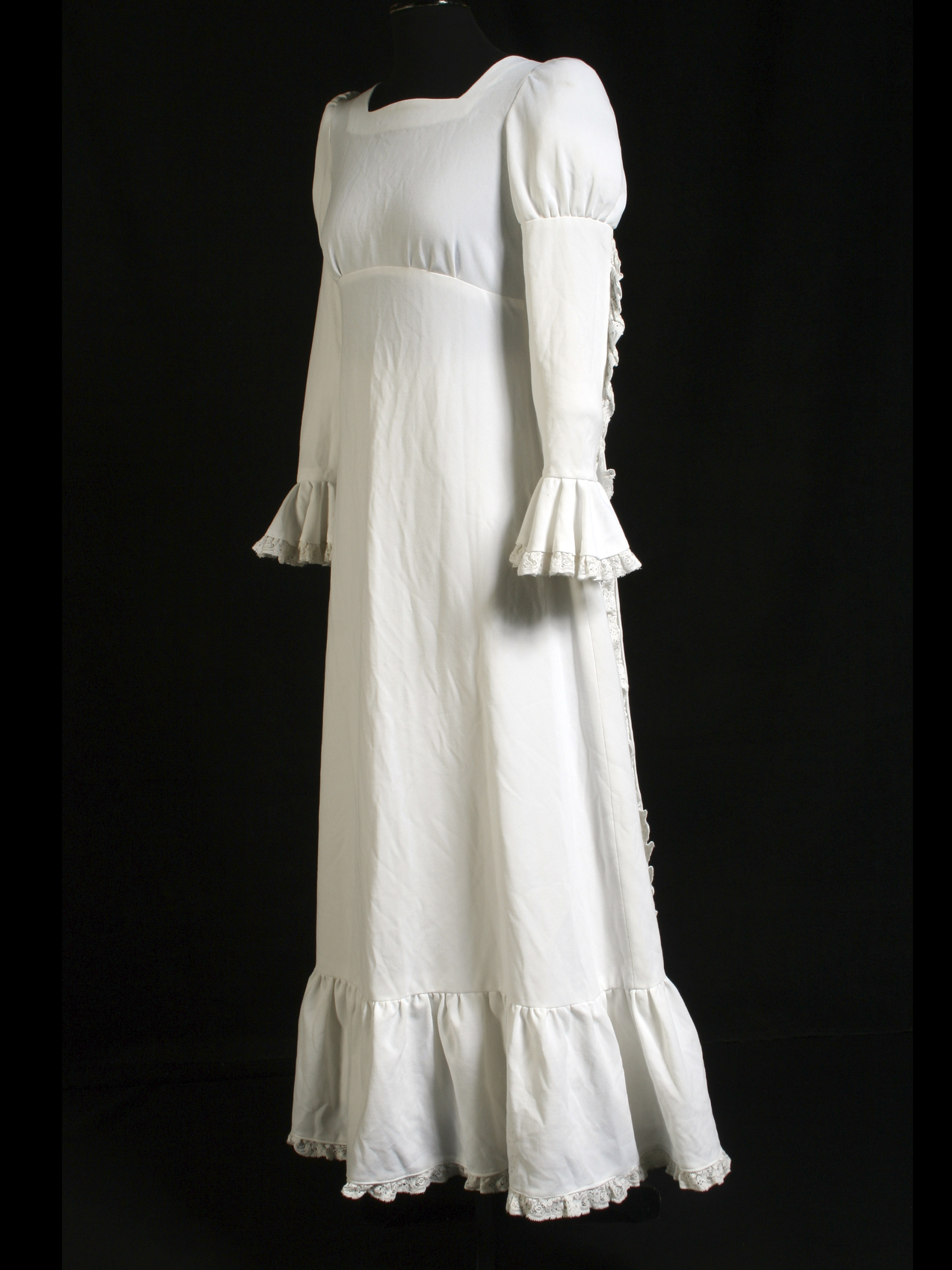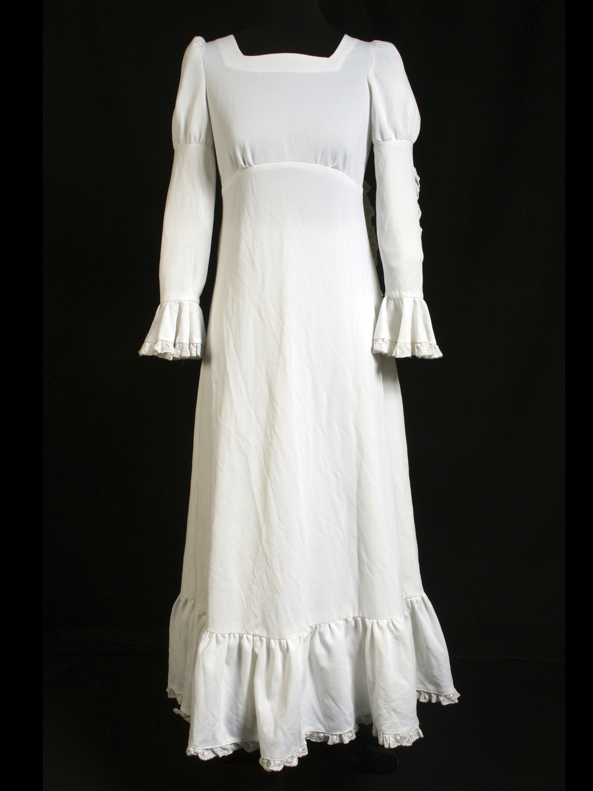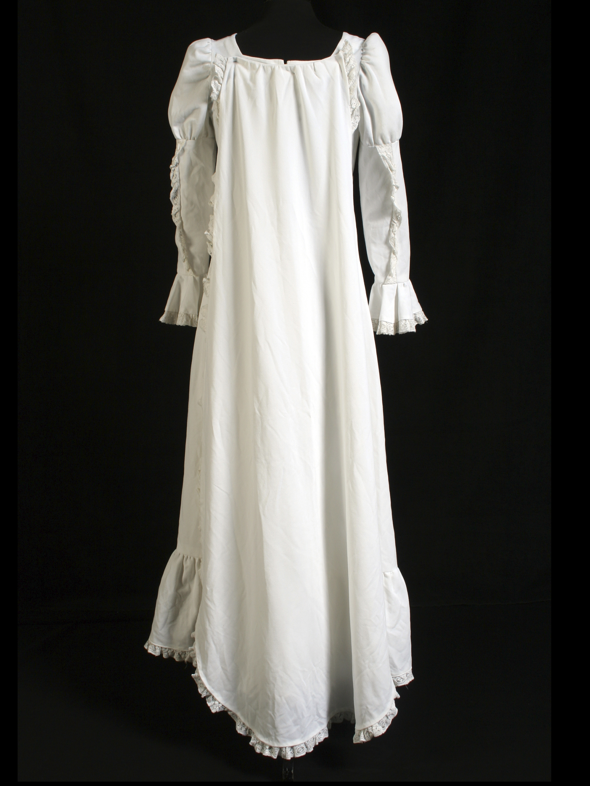 Long white wedding dress, square neckline, short train, long sleeves with wide cuffs, and lace applications along the arm, cuffs, skirt, and train. Functional metallic back closure. Additionally, it has a petticoat. This dress was worn by Verónica Díaz Guajardo at her wedding on March 11, 1978, in Rancagua. Made by Mrs. Alicia Guajardo, a dressmaker who studied at the Vocational School in Rancagua. Model obtained from the "Burda" magazine between 1970 and 1973. Donated by Claudia Loyola Díaz, daughter of the wearer.