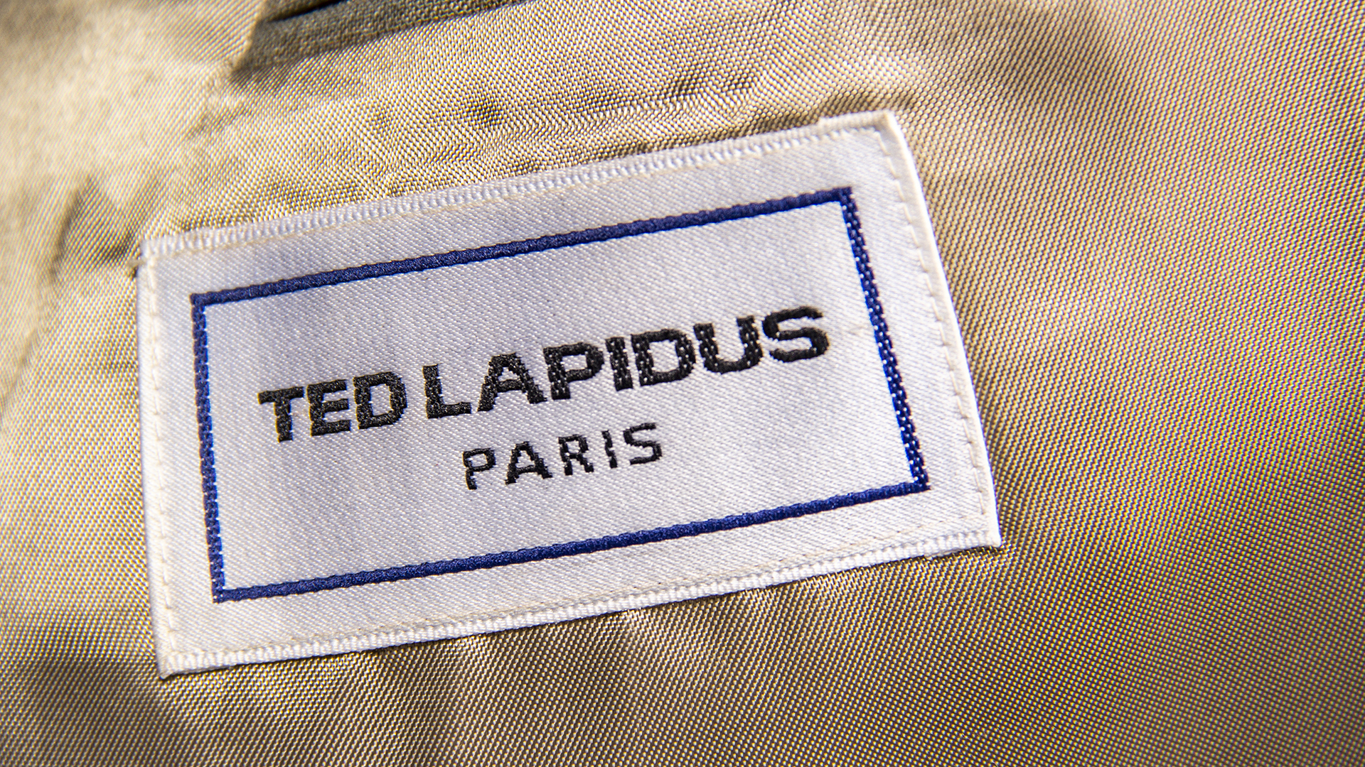Two-piece men's suit in greenish-gray color. The pants have two front pockets and two back pockets, one of them button-closed. It closes with a clasp, button, and invisible zipper. The jacket has two brown front buttons, two flap pockets, and one chest pocket with an eyelet. Three buttons on the cuffs, satin gray internal lining with lines, and four pockets. Labels: 'Ted Lapius Paris' and 'Xuga.' Made in Chile.