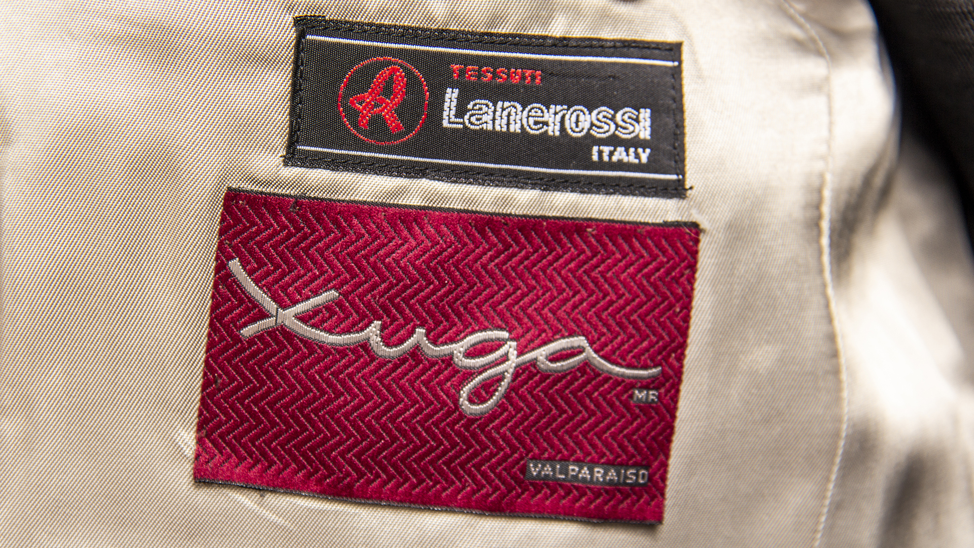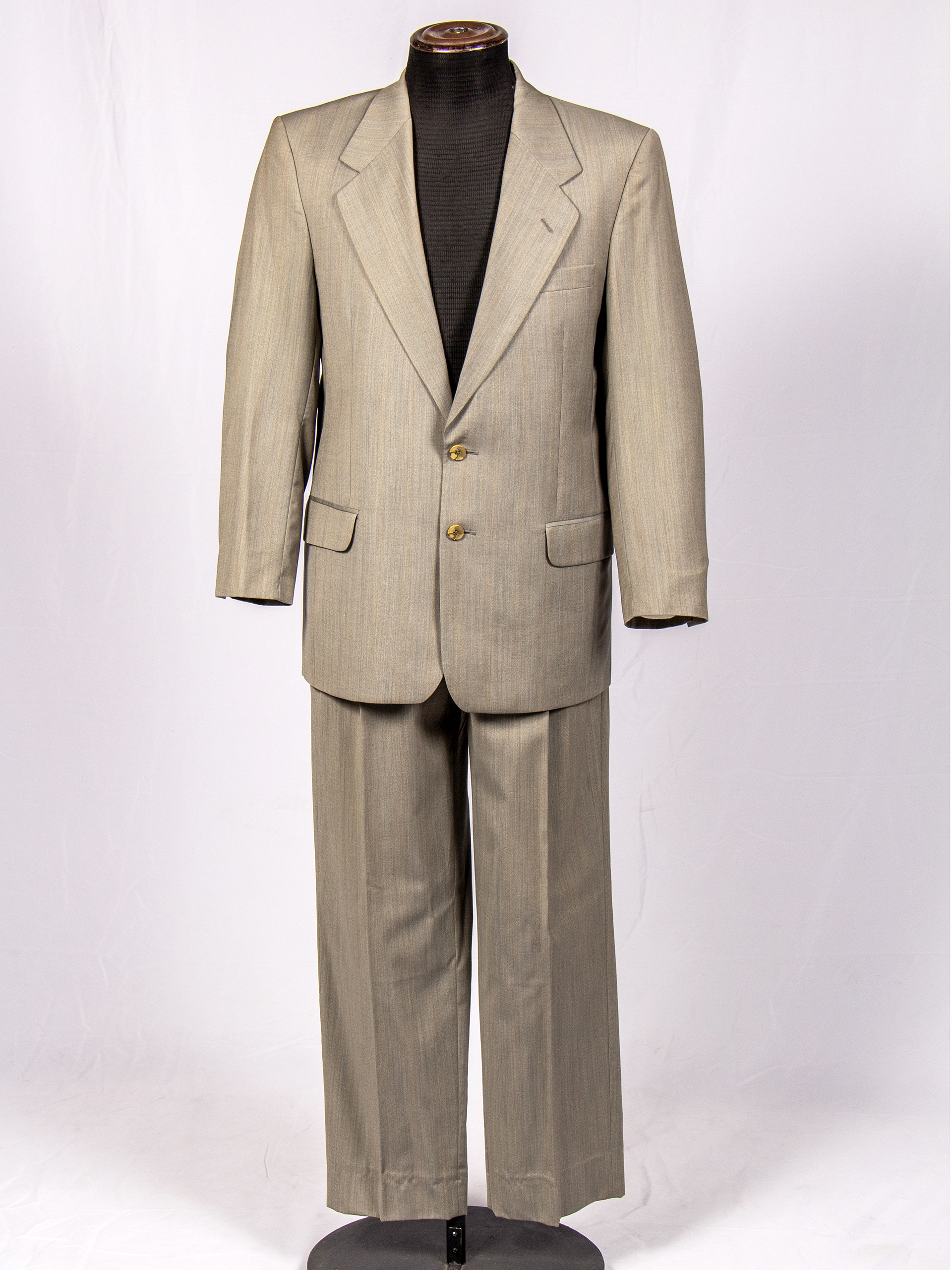 Traje de hombre de dos piezas de color gris verdoso. El pantalón, tiene dos bolsillos delanteros y dos bolsillos traseros, uno de ellos cierra a botón. Cierra con broche, botón y cierre invisible. La chaqueta tiene dos botones delanteros cafés, dos bolsillos con solapa y otro en pechera con ojal. Tres botones en los puños, forro intereno gris a líneas satinado y cuatro bolsillos. Etiquetas 'Ted Lapius Paris' y 'Xuga' Fabricación chilena.