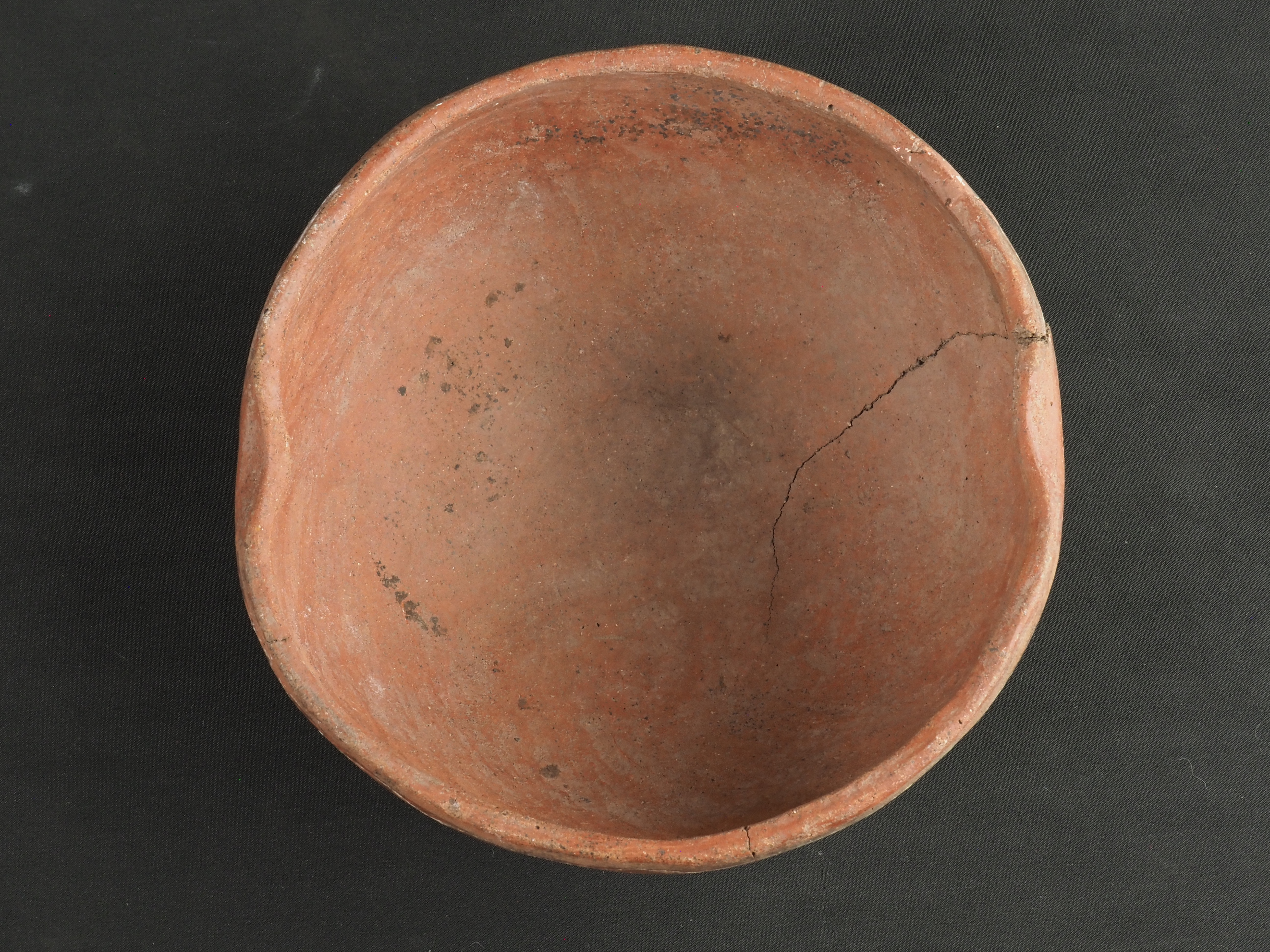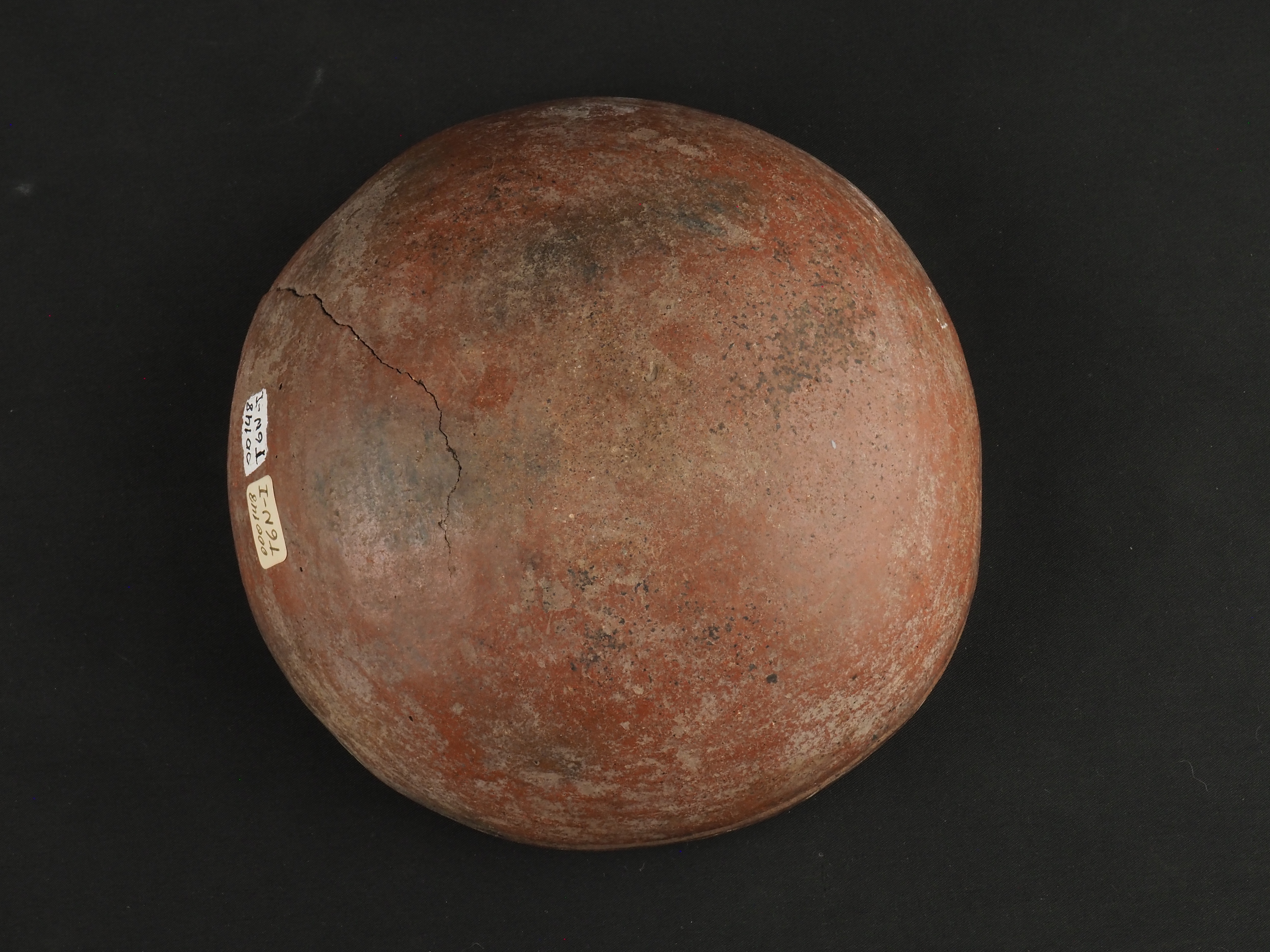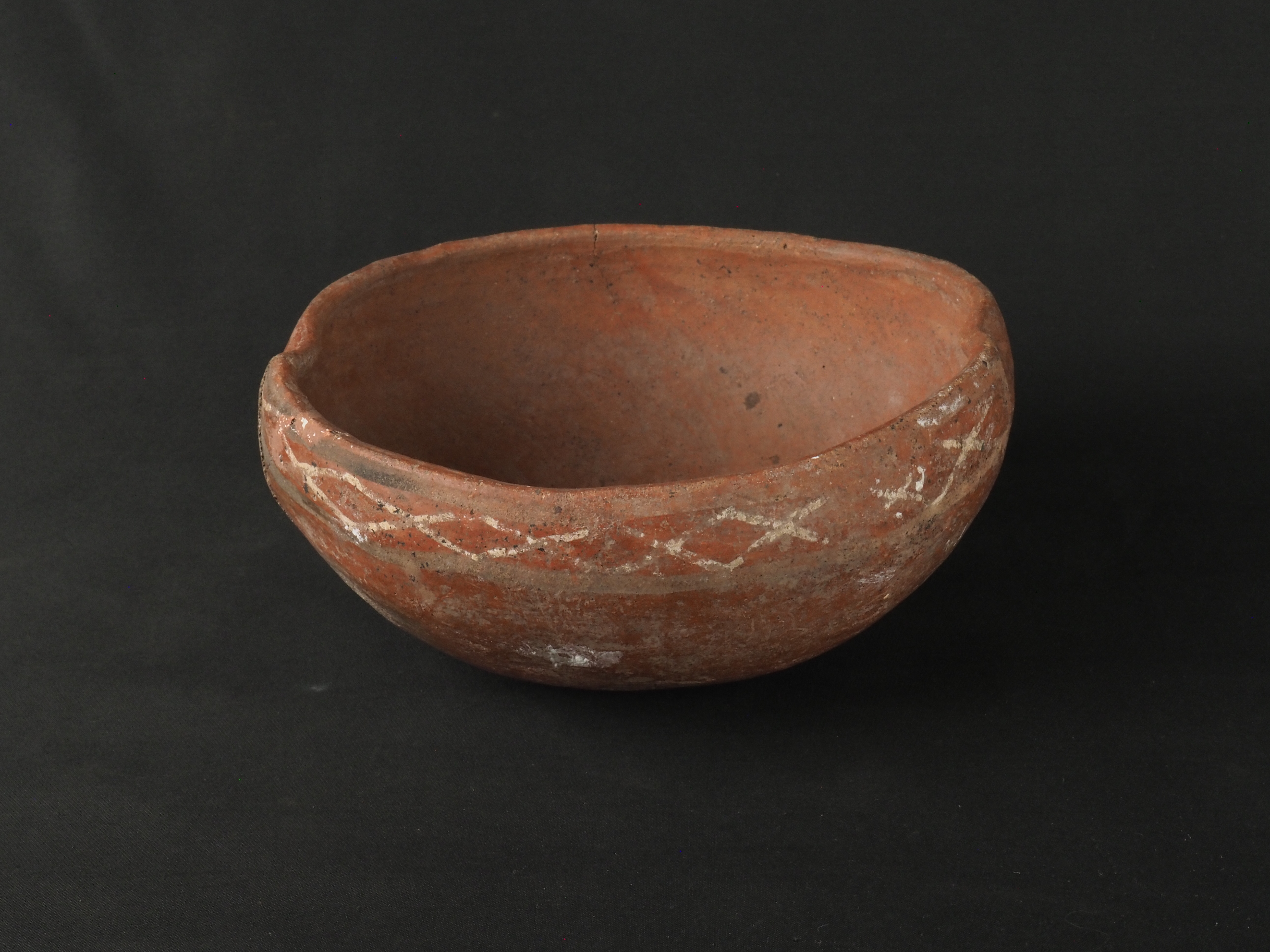 Contenedor abierto, de uso ritual y/o doméstico, rojo engobado en exterior y engobe blanco en interior. Decorado de forma polícroma con una greca de rombos rojos delineados con blanco, en pigmentos negro y rojo. Técnica: Arcilla modelada, alisada y pulida. Cerámica engobada policroma. Morfología: Objeto simétrico de estructura no restringida, perfil simple, cuerpo esférico, borde invertido con dos secciones hiperinvertidas de aprox. 2 cm, labio plano y base curva. La unidad estructural del objeto se presenta en fragmentos unidos.